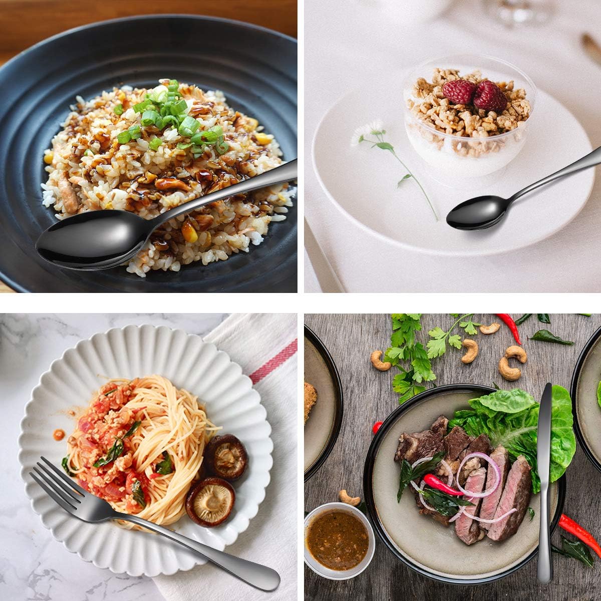 • DURABLE AND COMFORATBLE TO HOLD: This is very durable ,rust-proof, corrosion resistant,smooth edges and mirror polishing make this set of tableware always shiny and new in appearance. The edges of each tableware are double polished, and easy to wash by hand and dishwasher and comfortable to hold,moderate weight, moderate thickness, not easy to bend, suitable for daily use; The weight is just right, providing very comfort, neither too heavy nor too light it is one set of black flatware cutlery set