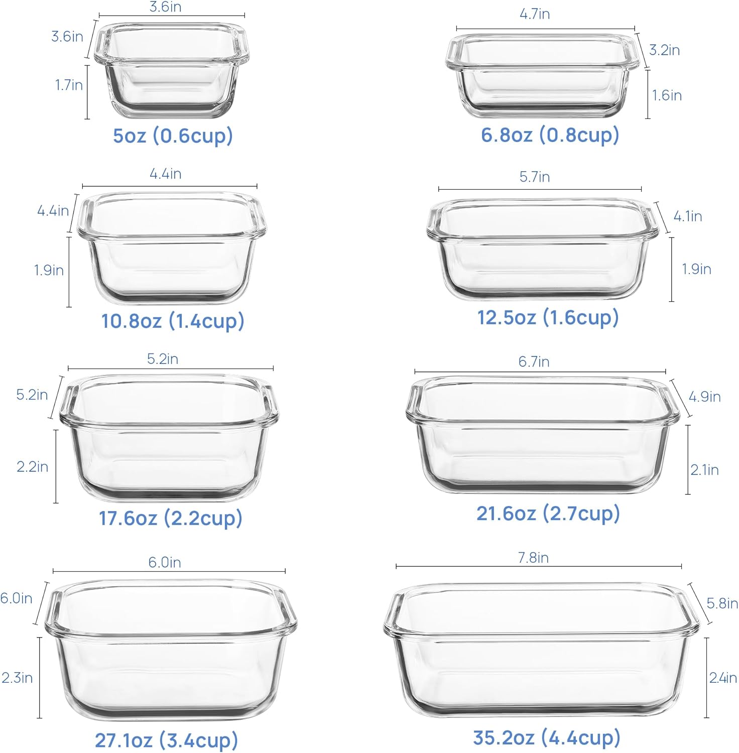 • 【Set of 8 Glass Storage Containers】Rectangle (35.1OZ)+(21.6OZ)+(12.5OZ)+(5OZ); Square (27.1OZ)+(17.6OZ)+(10.8OZ)+(6.8OZ); large and small containers are versatile for different use: meal prep food, leftover, sauce, lunch to go, RV, picnic, camping.