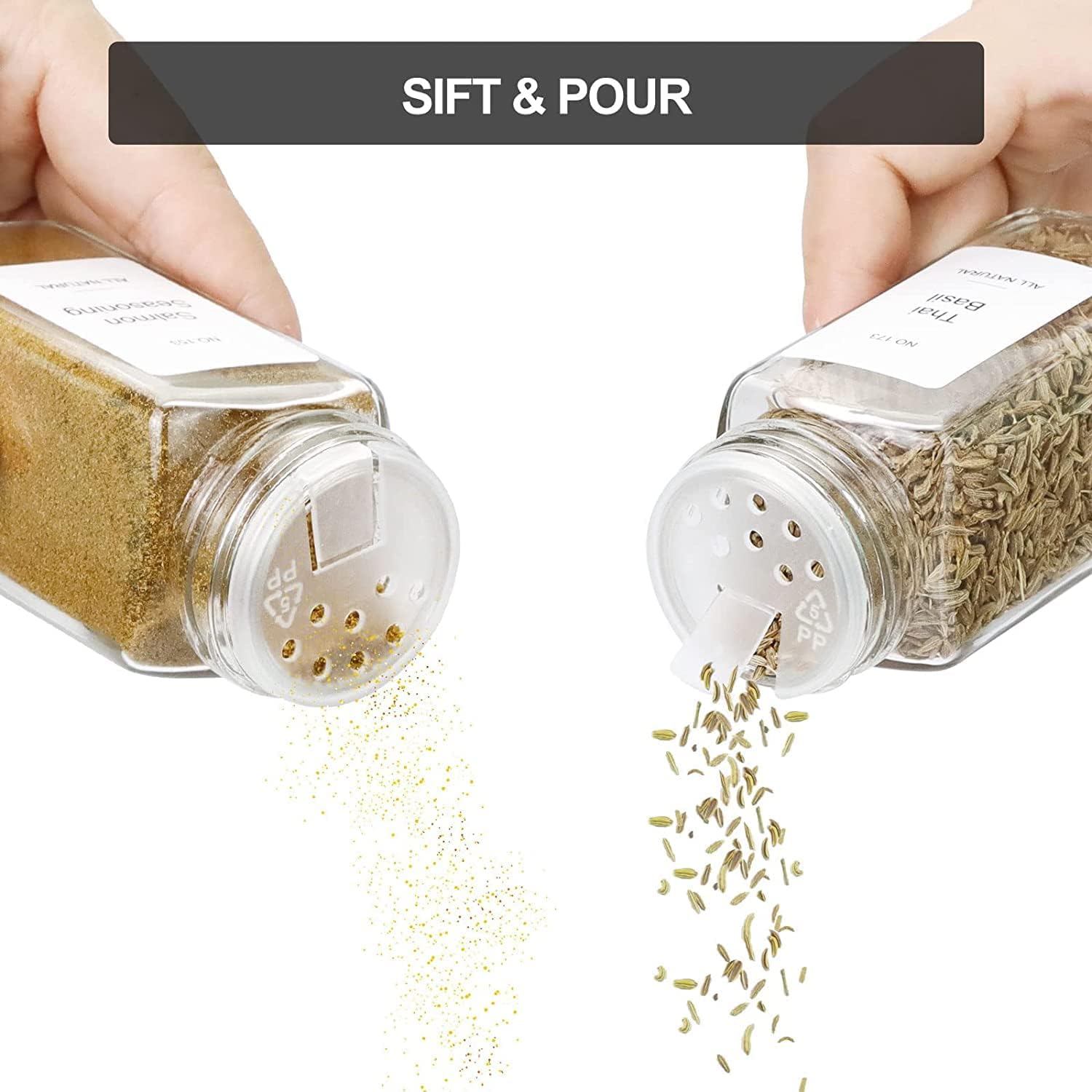 • 20 Glass Premium Spice Jars: Spice jars are made of lead-free glass,safe and shatter-resistance.20 dual functioning sift and pour lids; let you shake or use spoons to measure. The airtight aluminum caps protect prepared spices not exposed to air, keeping spices aromatic and flavorful.