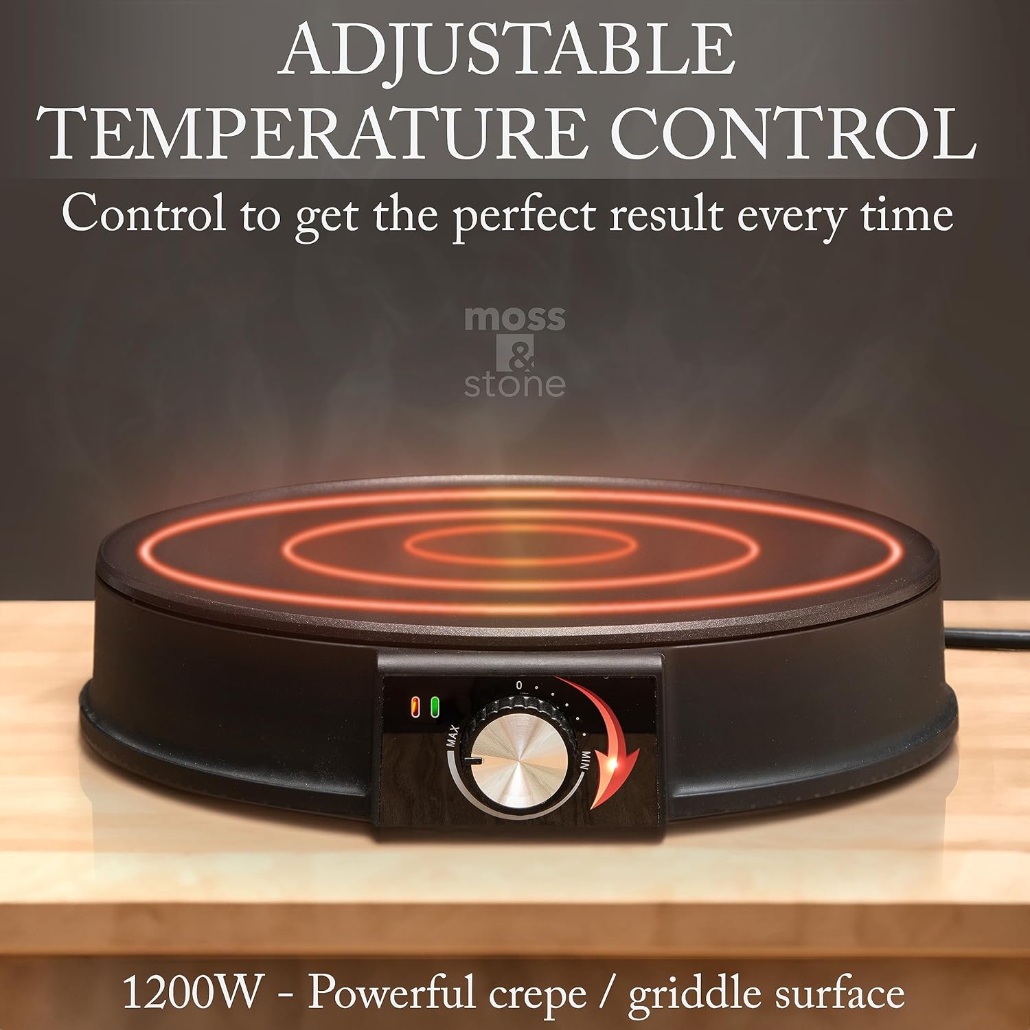 Moss & Stone 12” Electric Griddle Pan & Crepe Machine, Non-Stick Electric Crepe Maker with Adjustable Temperature, Includes Spreader & Spatula – Ideal for Pancakes, Blintzes & Tortillas