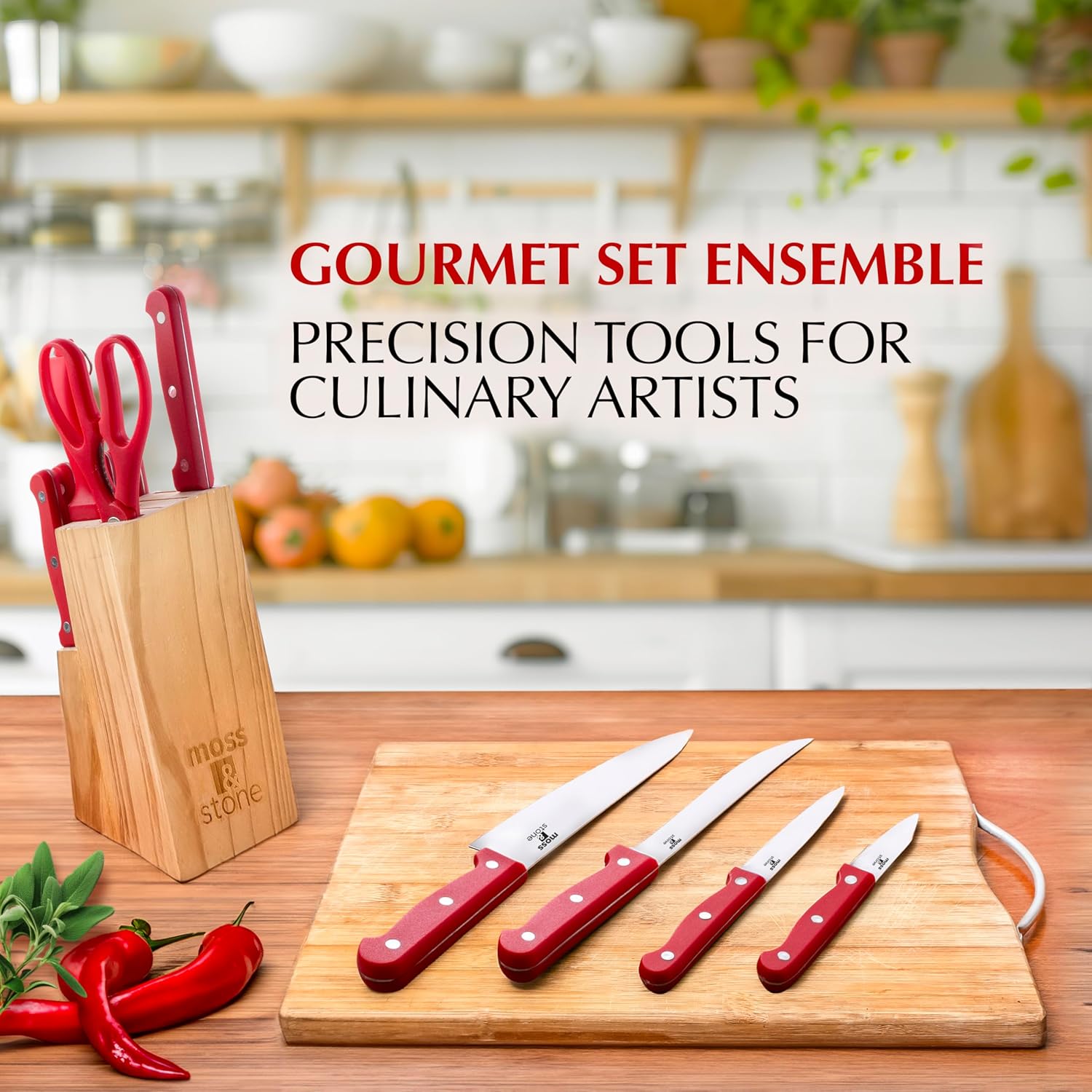 • Precision Cutting Knives: This chef knife set includes ultra-sharp forged stainless steel blades. The red knife set stainless steel delivers clean cuts with high-carbon kitchen knife precision.