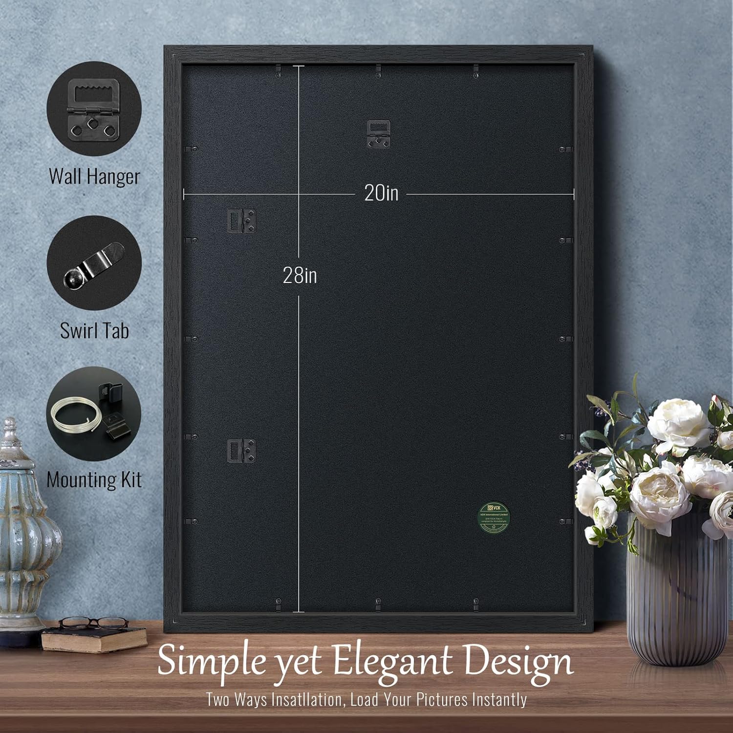 • PRODUCT FEATURES: The overall size is 29.8”x21.8” for Pictures 20x28 or 28x20, horizontal/vertical for table or wall display. Unlike others, special swirl tabs make the frame super easy to load pictures.