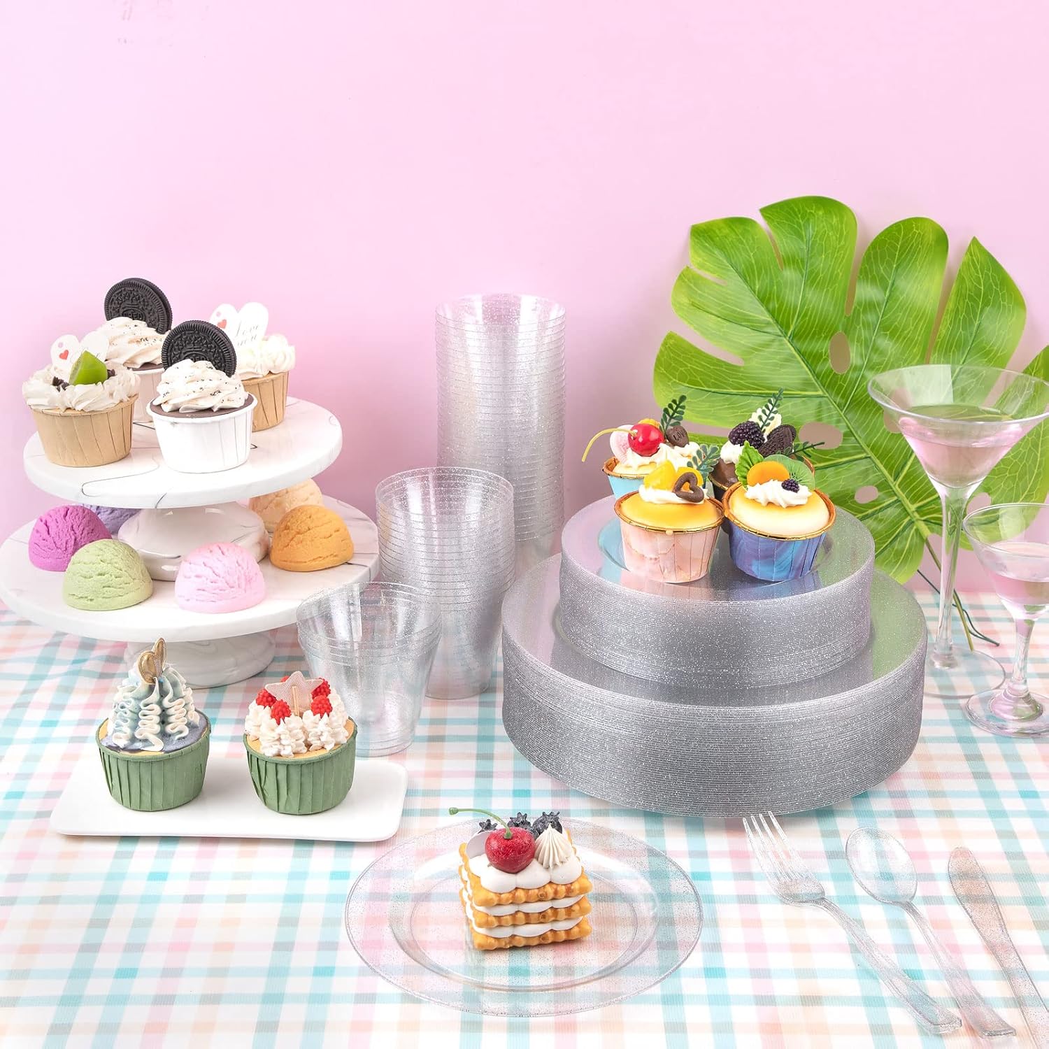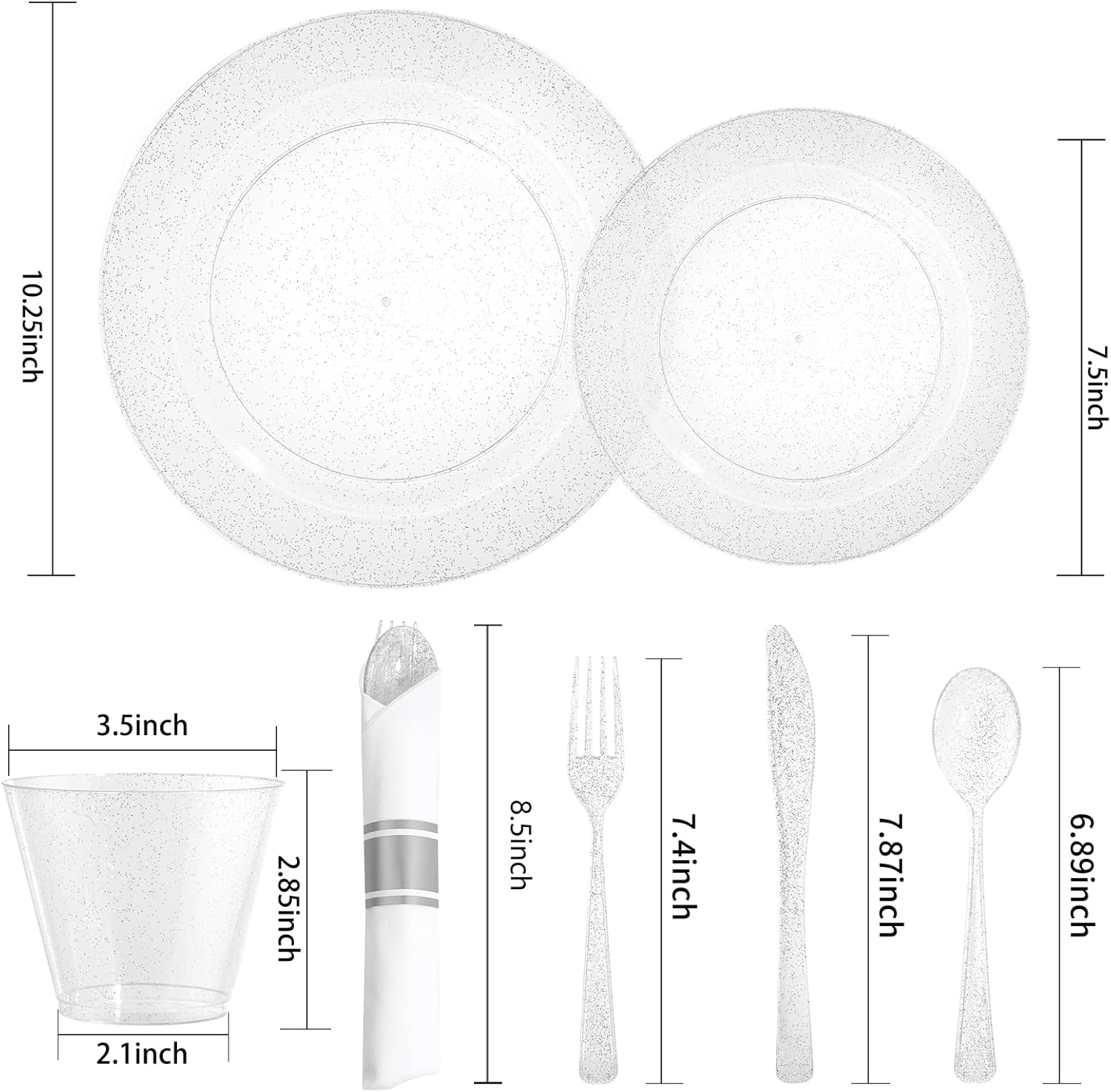 DaYammi 350 Pieces Silver Glitter Dinnerware Set 50 Guest for Party- 50 Dinner Plates, 50 Dessert Plates- 50 Per Rolled Napkins with Silver Cutlery- 50 Disposable Cups 9 OZ