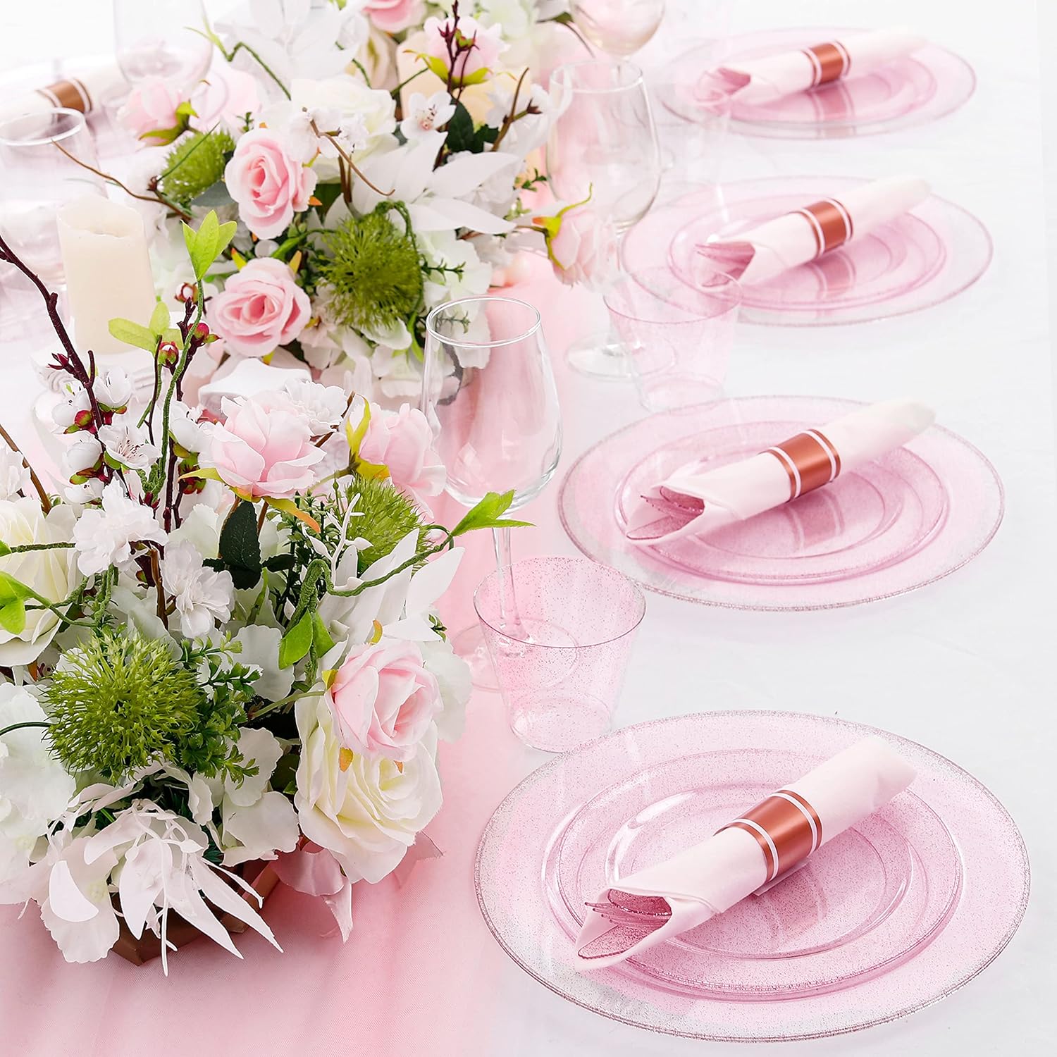 DaYammi 350PCS Rose Gold Glitter Dinnerware Set 50 Guest for Party- 50 Pink Plastic Dinner Plates, 50 Dessert Plates- 50 Per Rolled Napkins with Rose Gold Glitter Cutlery - 50 Cups 9 OZ