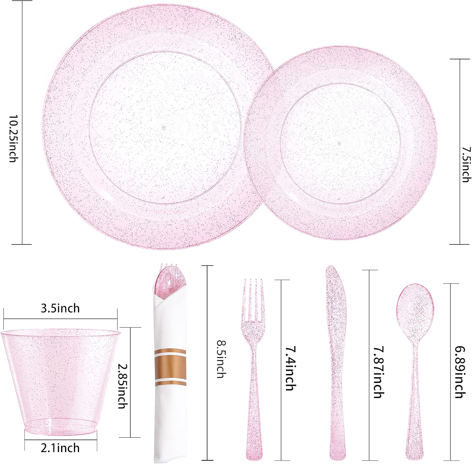 • HIGH QUALITY & DURABLE: Our sturdy rose gold glitter plastic plates are able to hold a larger volume of food, sharper rose gold glitter plastic knives can cut through the thickest food items with ease.