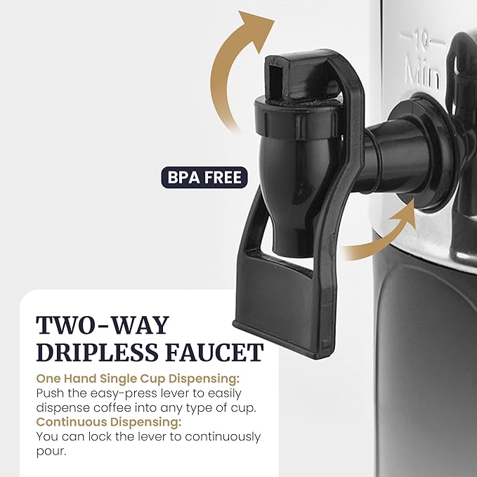 • CONVENIENT 2-WAY DISPENSING: Allows guests to fill one single cup with a quick flip of the lever. Or flip the lever completely down to continuously fill a larger carafe.