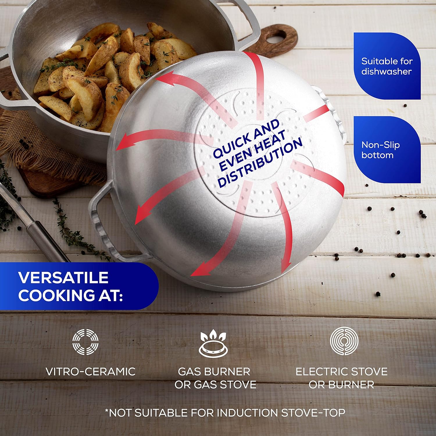• 🔒 Enhanced Safety for Home Cooking: The non-slip bottom keeps the pot securely in place on gas, electric, and vitroceramic stoves. Ergonomic handles ensure a comfortable grip, while the anti-drip lid and wide, heat-resistant knob help prevent spills and burns.