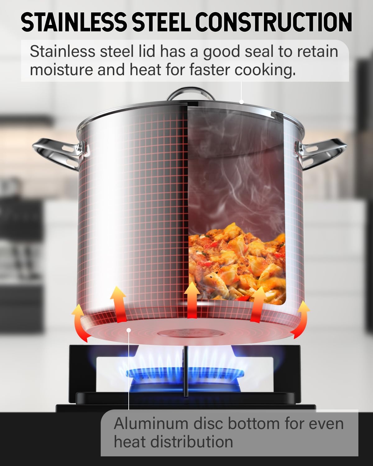 • Even Heating: Stainless steel stock pot with impact bonding aluminum disc in bottom; The aluminum core ensures that heat is evenly distributed /quick and no hot spots