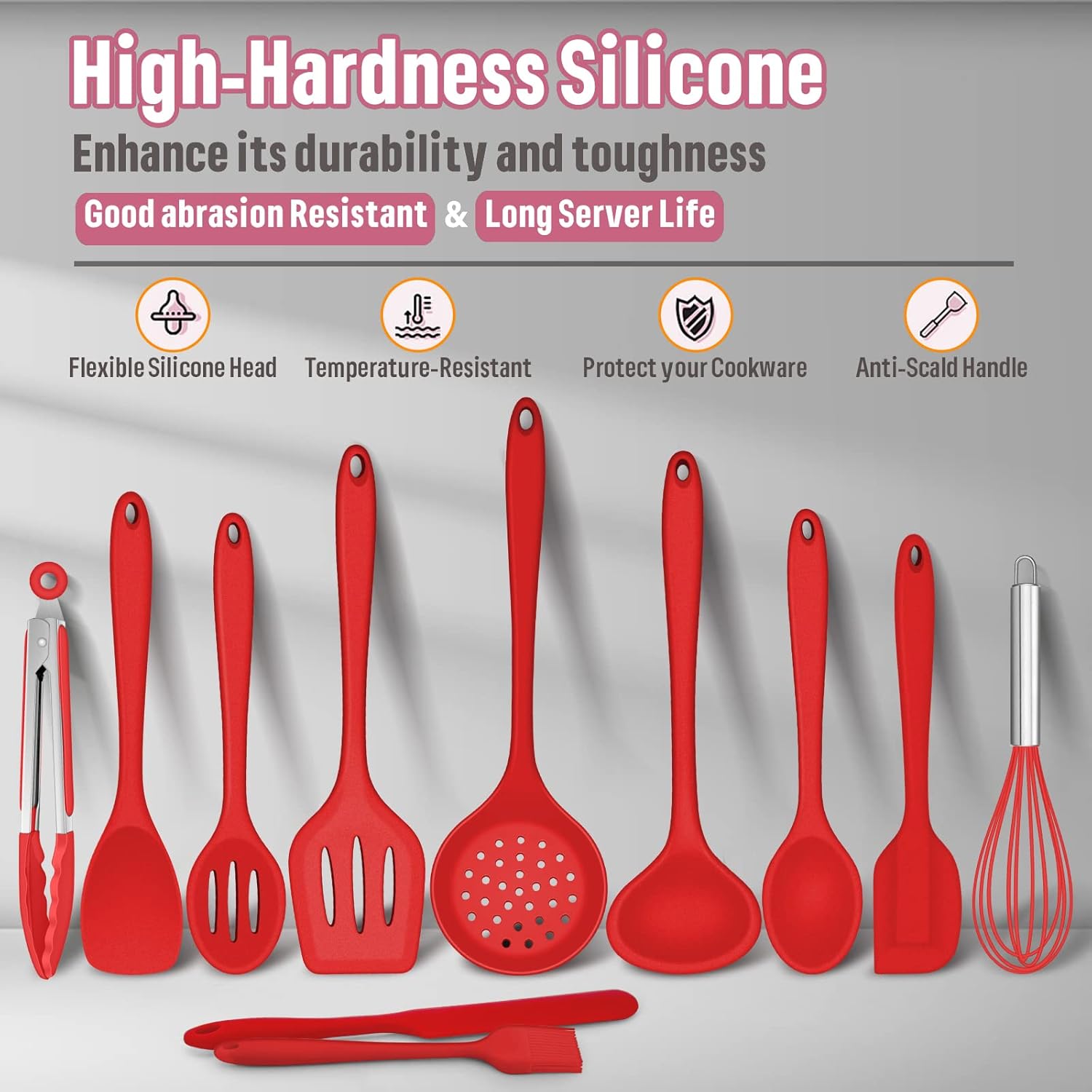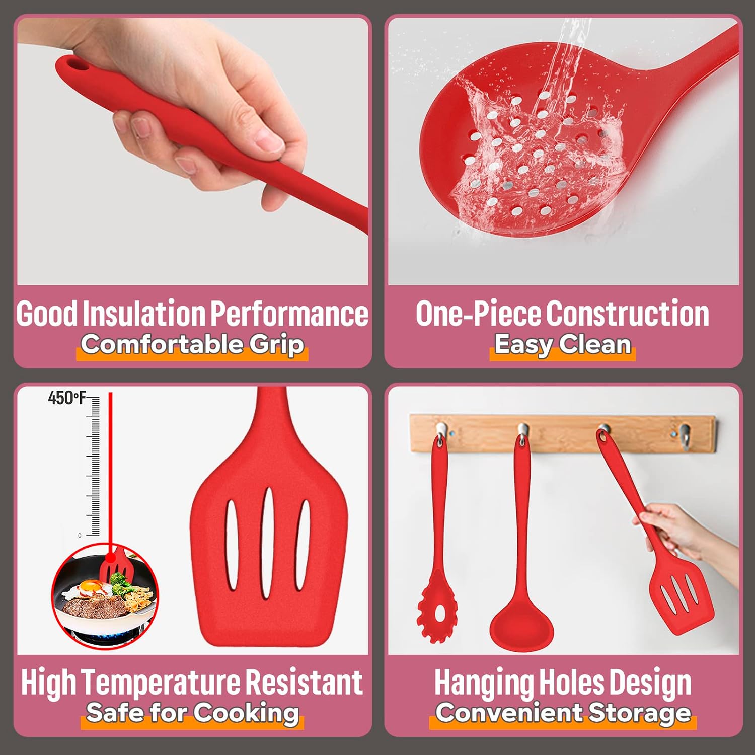 Silicone Kitchen Utensils Set, E-far 23 Pcs Red Cooking Utensils Tools with Holder for Nonstick Cookware, Include Spatula/Spoon/Ladle/Tongs/Turner, Heat Resistant & Nontoxic, Dishwasher Safe