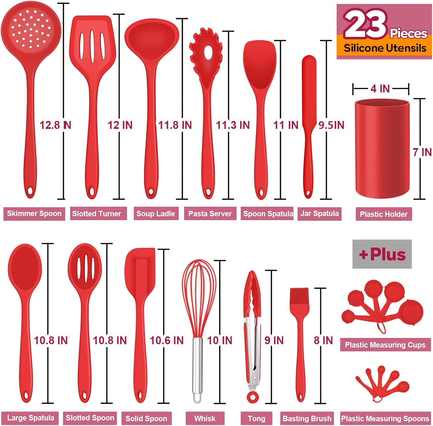 • 23 PIECES IN 1 SET- Meet most kinds of your kitchen needs: 1 for each: spreader spatula, flexible spatula, salad spatula spoon, solid spoon, slotted spoon and turner, pasta server, ladle, skimmer, brush, plastic holder, tongs, whisk with stainless steel handle, 5 for each: plastic measuring spoon & cup, Good choice as a gift