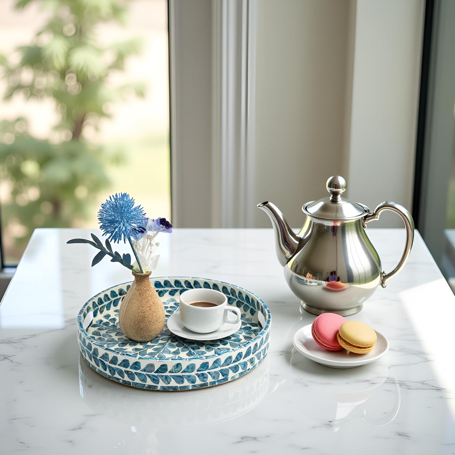 CLAYNIX Serving Tray 12.5 Inch, Lacquer Mother of Pearl Inlay Mosaic Tray, Round Wooden Marble Tray with Handles Trays for Tea, Breakfast (Leaf Style)