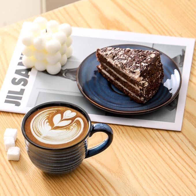 Hasense Ceramic Cappuccino Cups and Saucers Set of 4, 8 oz Tea Coffee Cups Set for Home and Office, Espresso Mugs for Coffee, Cappuccino, Latte, Americano, Milk and Tea - Navy Blue