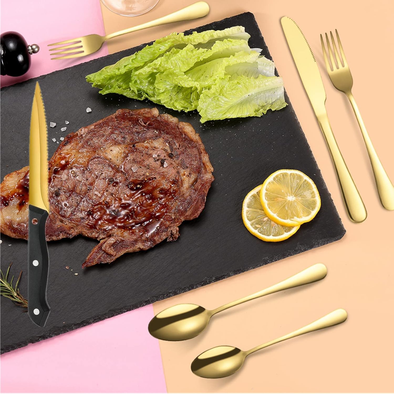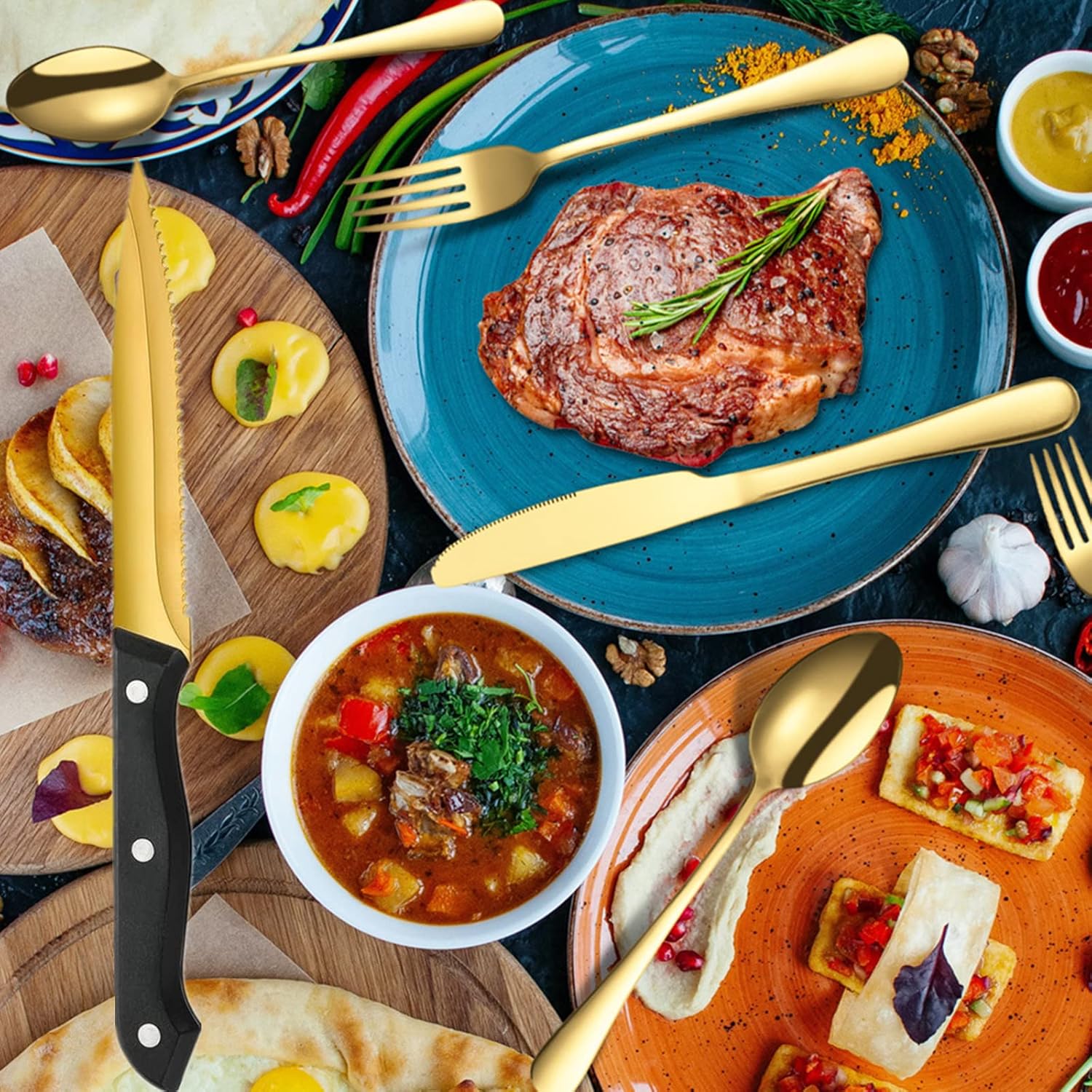 • QULITY stainless steel: This gold 24-piece stainless steel flatware set is a great addition to your table. The set includes 4 dinner forks, 4 dinner spoons, 4 dinner knives, 4 steak knives ,4 salad forks, and 4 teaspoons,The set is made of quality stainless steel and has a brushed finish.and suitable for Easter Halloween Thanksgiving Christmas New Year's Day Any Festival Occasions