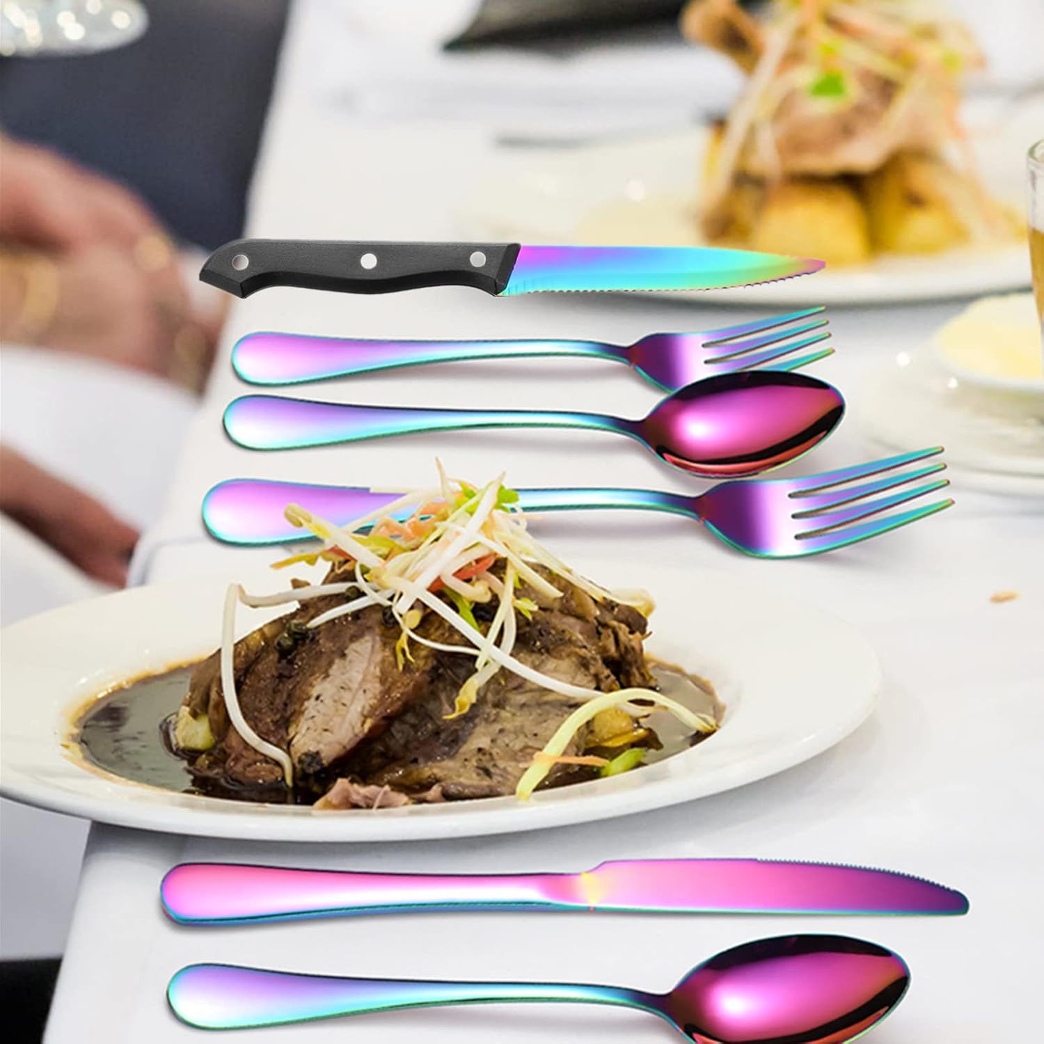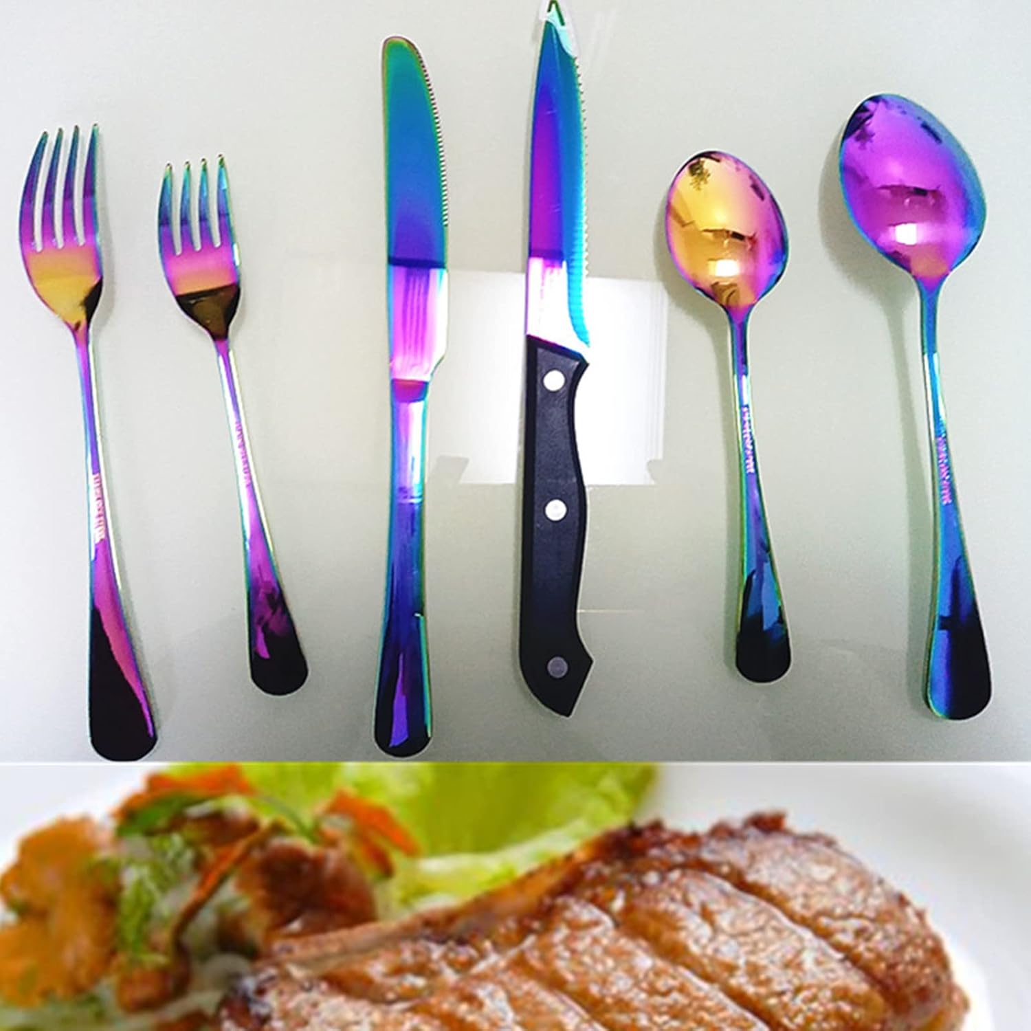 • QULITY stainless steel rainbow cutlery: This 24-piece stainless steel flatware set for 4 is a great addition to your table. The set includes 4 dinner forks, 4 dinner spoons, 4 dinner knives, 4 steak knives ,4 salad forks, and 4 teaspoons,The set is made of quality stainless steel and has a brushed finish.and suitable for Easter Halloween Thanksgiving Christmas New Year's Day Any Festival Occasions