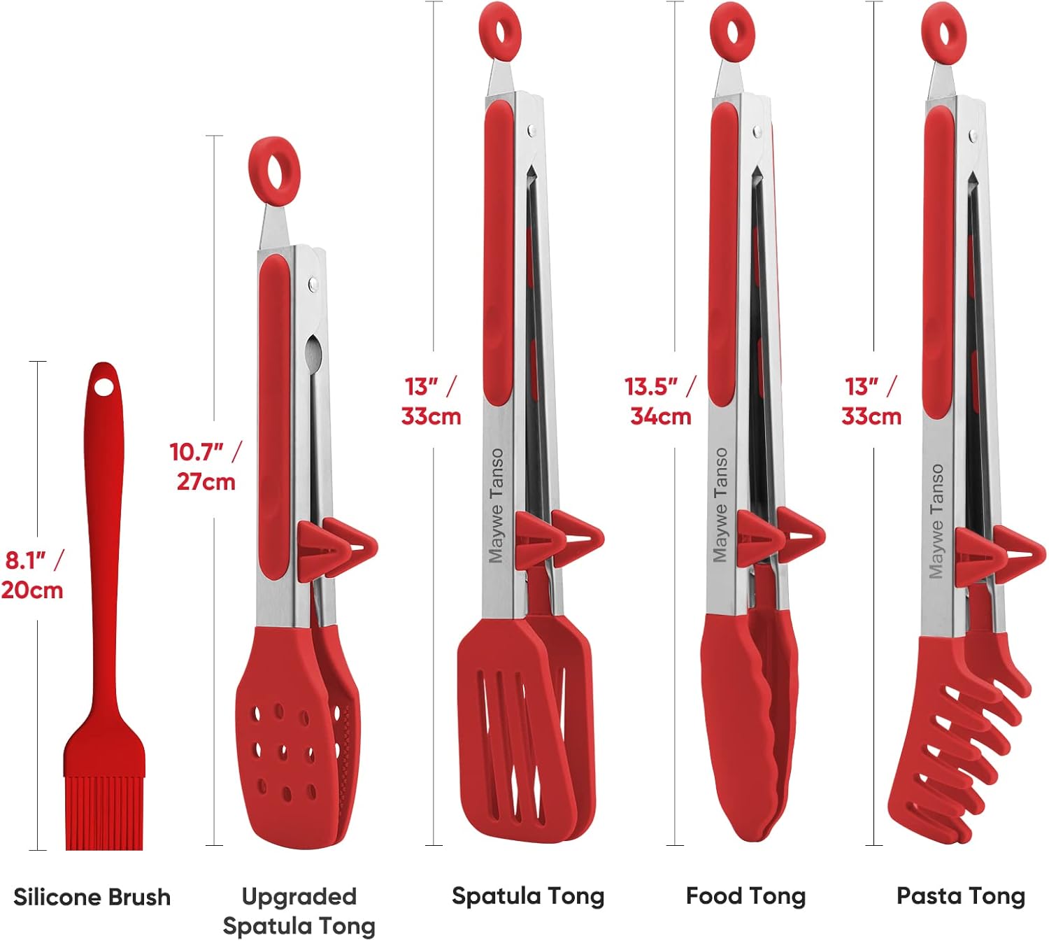 • SILICONE KITCHEN SET: Our red tongs set includes 1pc 13.5" Food Tong,1pc 13" Spatula Tong,1pc 13" Pasta Tong,1pc 10.7" Steak Tong and 1pc 8.1" Silicone Brush.Designed in red color and stainless steel tones,this silicon tongs kitchen utensils set has an super fashionable look,practical function that is madly in line with the current styles and daily needs.Comes in a exquisite box,it is sure to delight your friends and family!