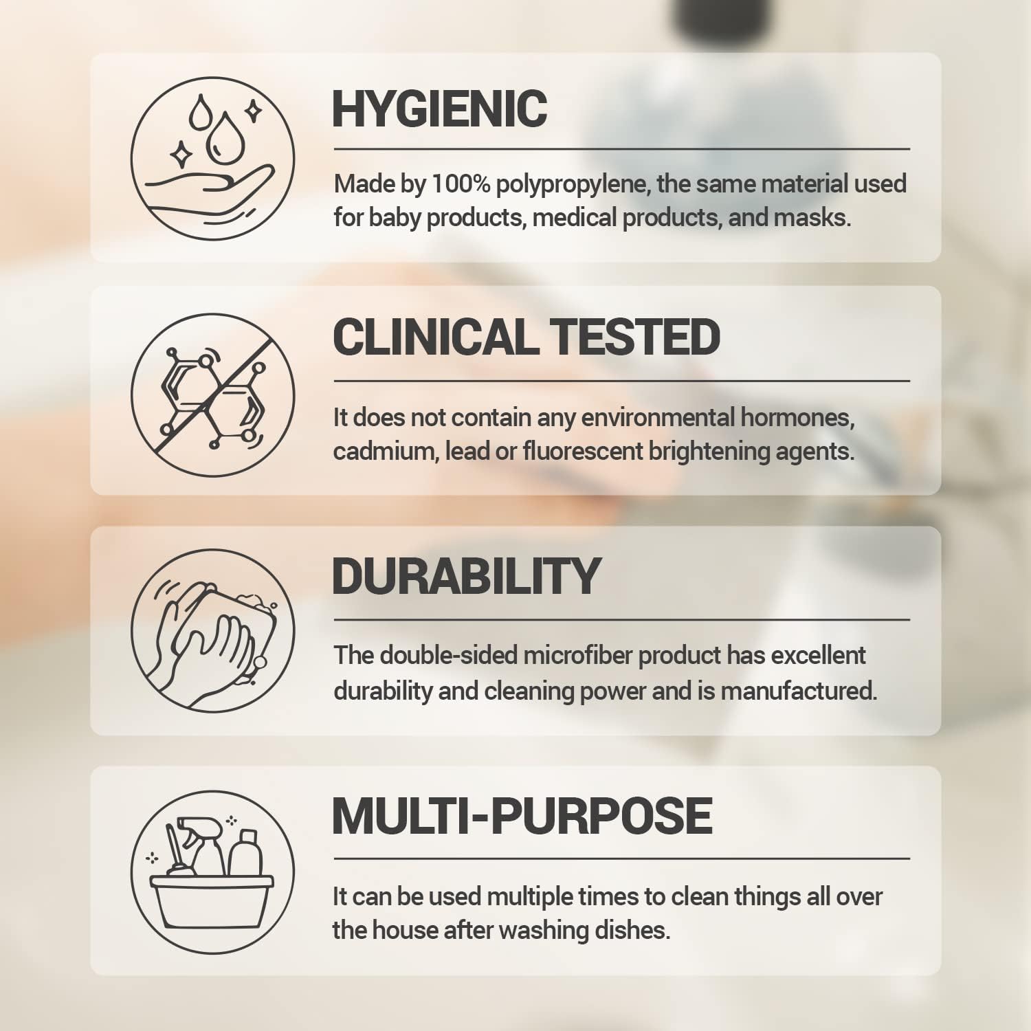 • DURABLE AND HIGH-QUALITY MATERIALS: These cleaning cloths for kitchen are made using 100% polypropylene material. The same material is used for baby products and medical products, and masks. These double-sided microfiber cleaning rags have excellent durability and power to clean cookware, cooktops, and counters.