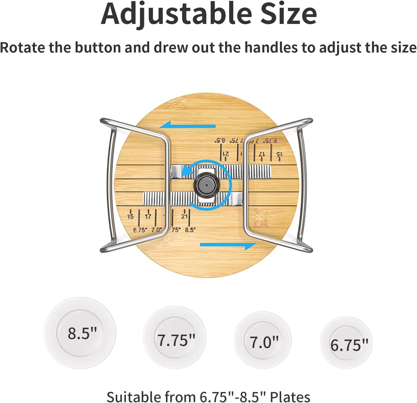 • 【ADJUSTABLE SIZE】With a height of 6.18 inches, this plate organizer for drawer is suitable for drawers taller than 6.3". The small rack fits 6.75" - 8.5" plates. Adjust the size according to your dish's dimensions by rotating the bottom nut and extending the handles.