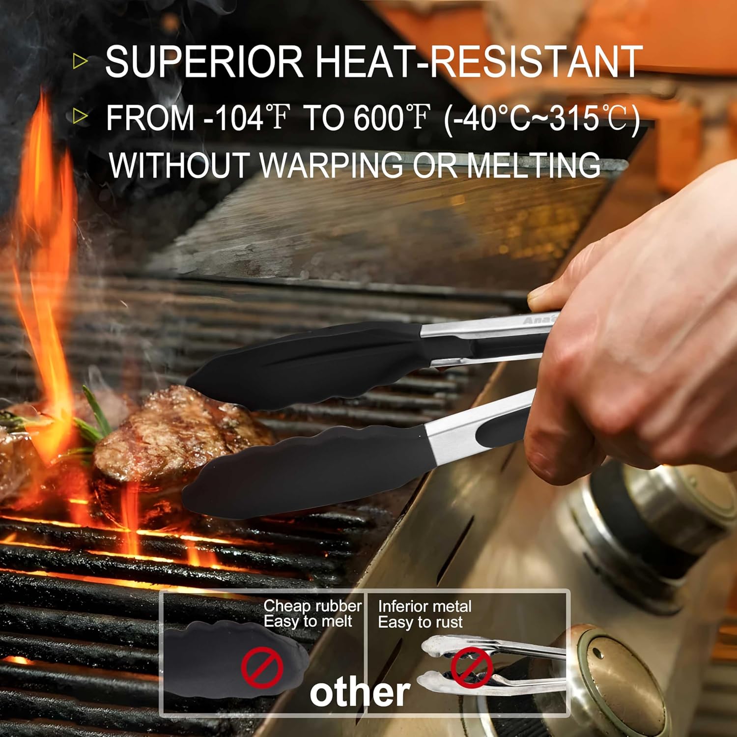 • HIGH HEAT RESISTANT SILICONE TIPS WITHOUT MELTING - Made of high quality thicken stainless steel and BPA-free silicone, HEAT RESISTANT UP TO 480°F, making Anaeat cooking tongs durable and resistant to corrosion and rust. The silicone tong tip is heat resistance and less prone to scratch the pan. Easy to clean and Dishwasher Safe. Just pop these handy silicone tongs in your washer for easy clean-up.