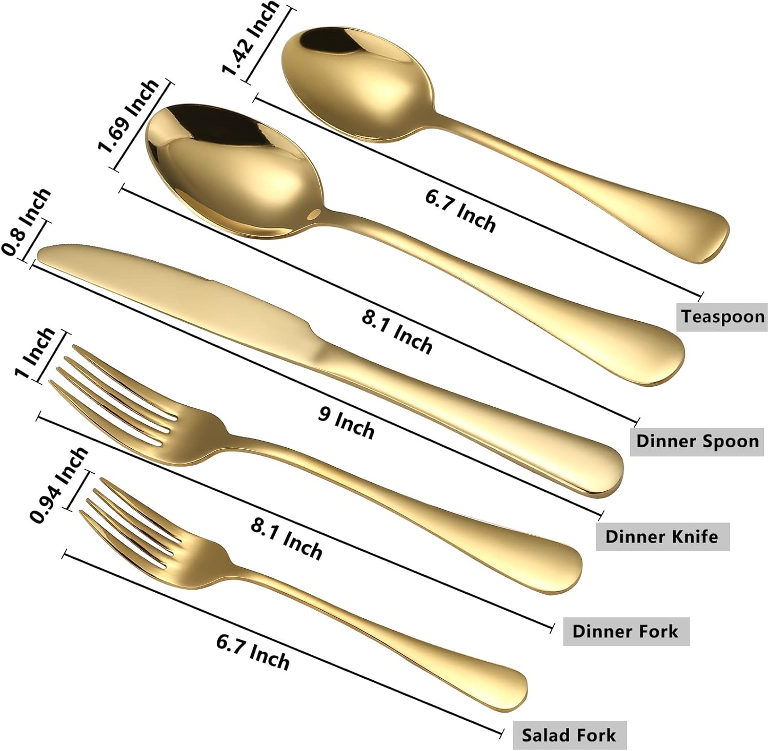 • HIGH QUALITY: This gold flatware set is made of premium stainless steel food grade material, which is healthy and durable not easy to bend, corrosion resistant, rust-proof, non-toxic, providing long-term safe use for you and your family.