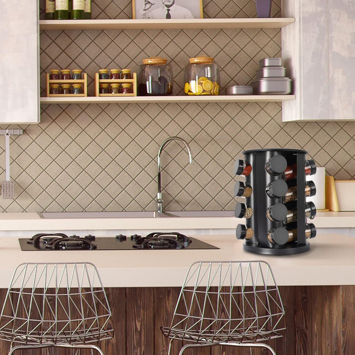 Black Countertop Rotating Spice Rack,Round Empty 16-Jars Revolving Spice Rack Organizer, 135 Spice Labels with Funnel Complete Set, for Kitchen Countertop, Cabinet