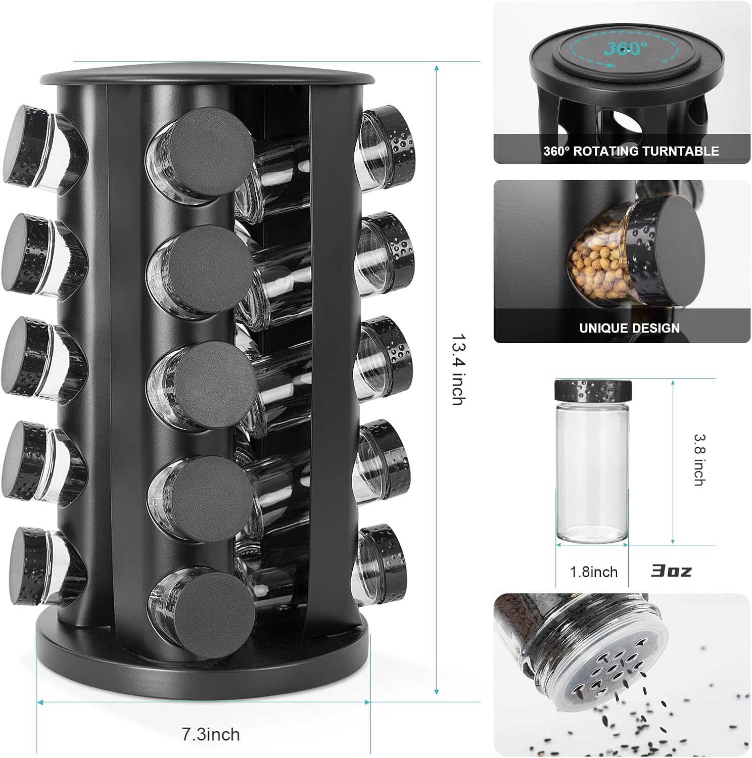• KEEP YOUR KITCHEN CLEAN AND TIDY - It features 360-Degree a revolving design, saves more space and is easy to use while cooking. The spice rack organizer only 13.4"H x 7.3"L in size (with jars on it), saves more space for your kitchen and cabinet. Up to 20 spice jars can stores many kinds of spices, no jar on the cabinet in disorder.