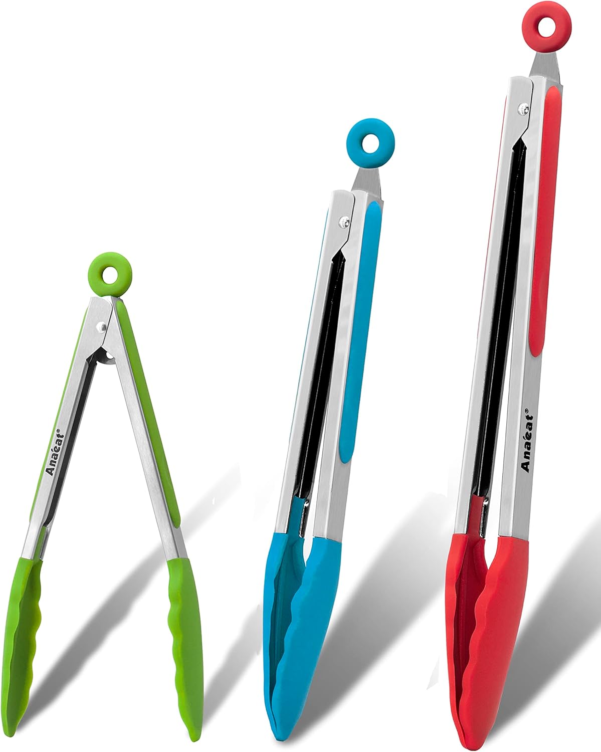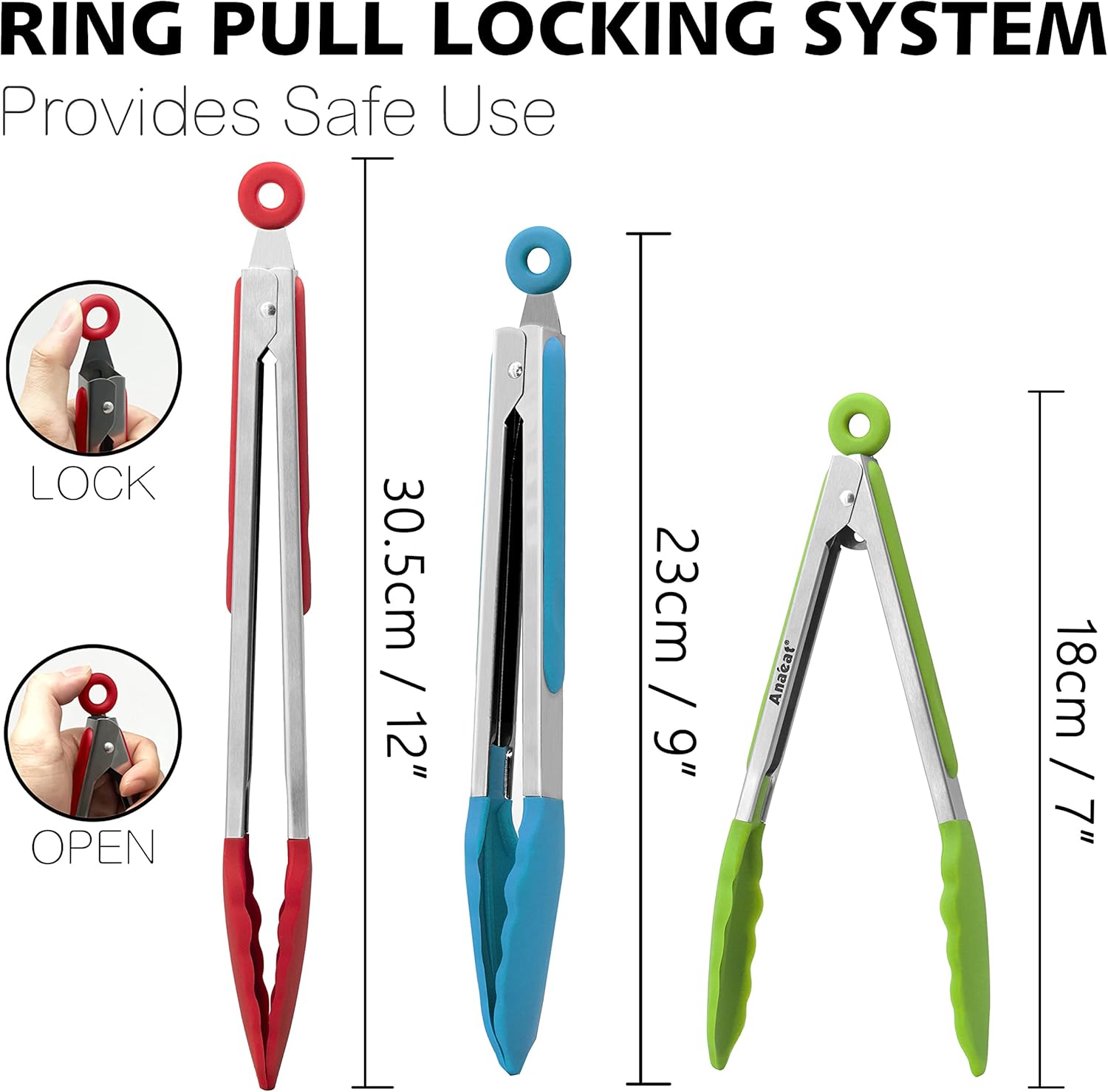 Anaeat Non-Stick Silicone Locking Tong Set of 3 - Stainless Steel 7", 9" and 12" Kitchen Food Tongs with Non-Slip Silicone Tips and Grip for Cooking, Baking and BBQ - Heat Resistant up to 480°F