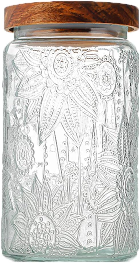 • QUALITY MATERIALS: Food storage glass jar is made of high quality thickened glass, with rubber ring inside the lid, the appearance of the airtight glass jar is made of vintage embossed design concept, exquisite and beautiful