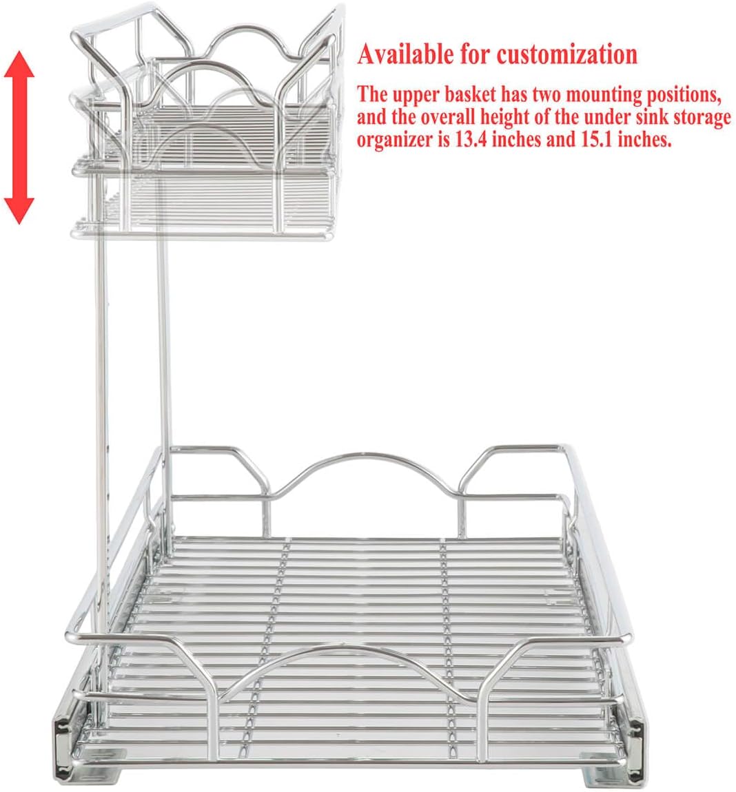 • Customizable Installation Design: better adapted to different cabinets. The upper basket has two mounting heights to choose from, and the lower basket can also be adjusted by different mounting methods of the bracket. If your cabinet has a lip, this design can easily help you solve the problem.