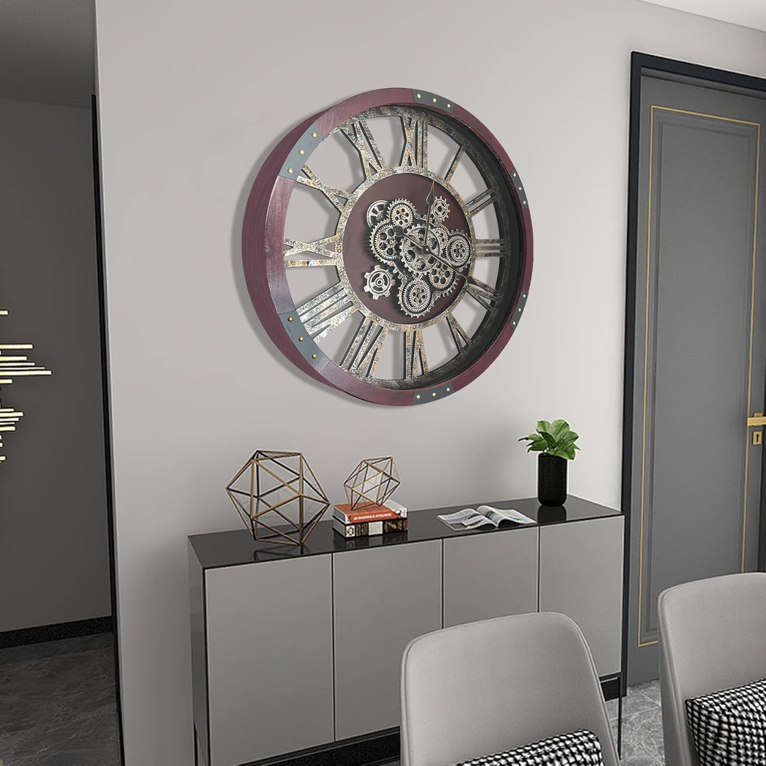 DORBOKER 36" Original Moving Gears Wall Clock, Large Industrial Wall Clock for Living Room Decor,Oversized Wood Vintage Farmhouse Steampunk Rustic Clocks for Wall Decor,Cherry Red