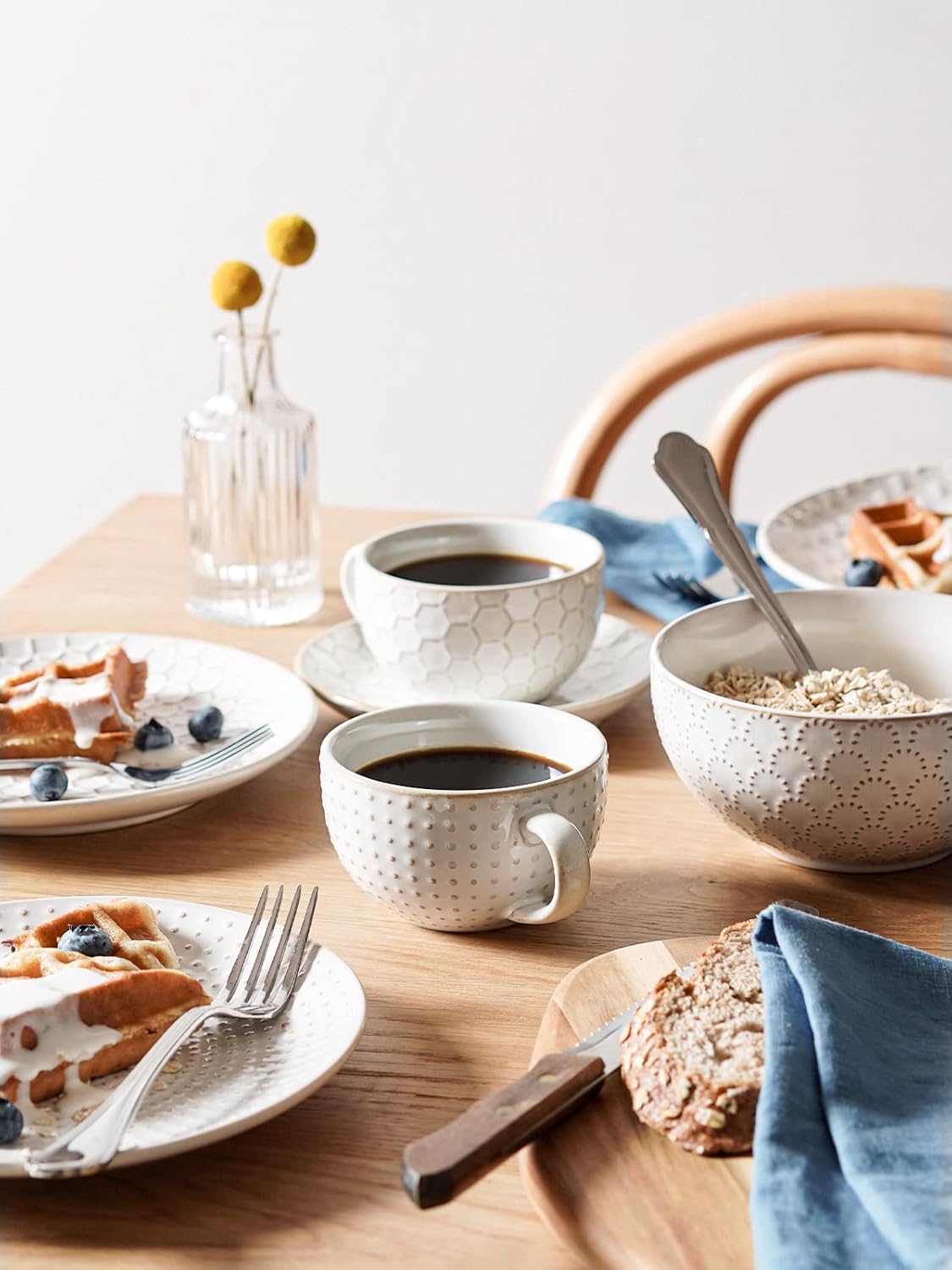 • Four Different Pattern Design: The outside of the cups are embossment which have four styles. The inner glaze is a smooth ceramic surface. . New homeowners will like the timeless farmhouse look of these bowls.Enough space for a coffee spoon and biscuit while enjoying a cup of lungo coffee