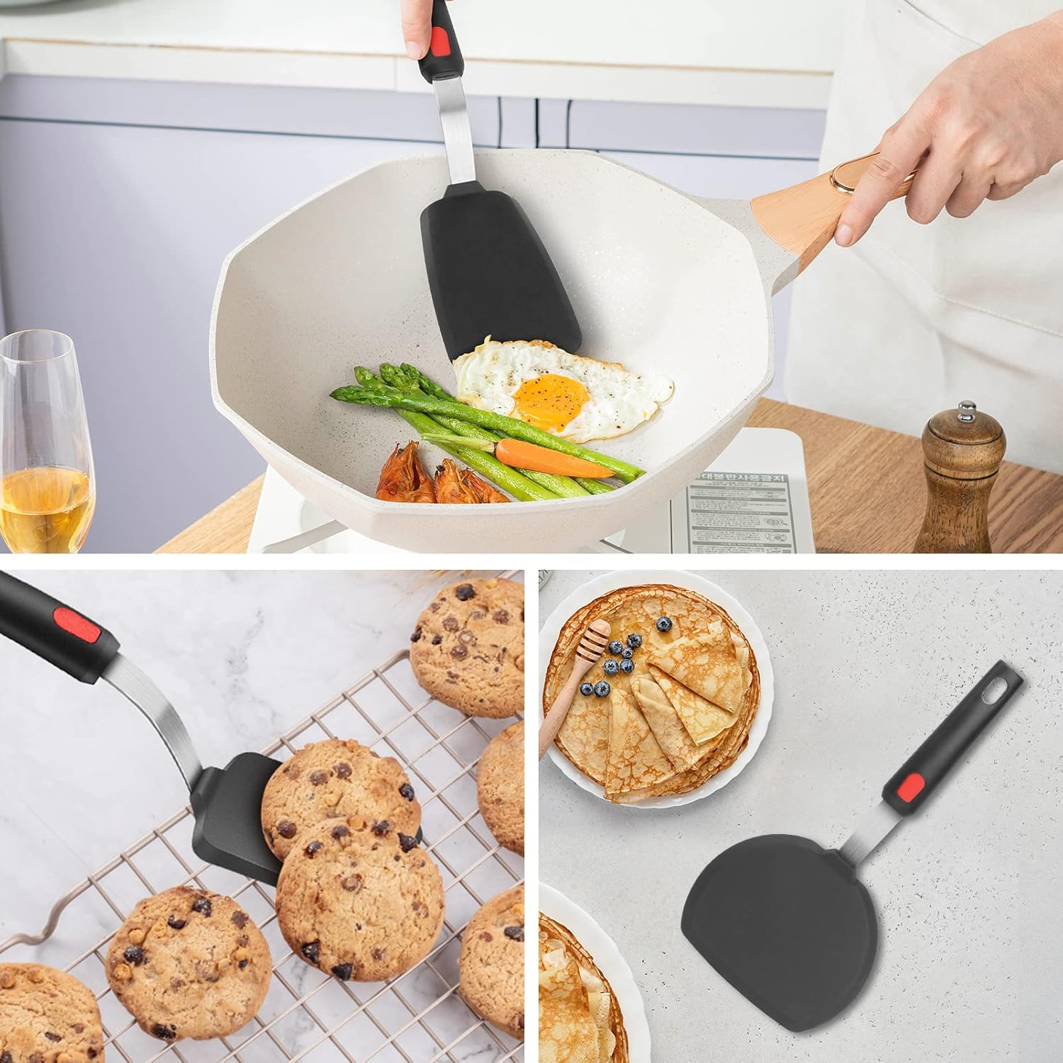 • 🍳 Safe for Nonstick Cookware This 3-pack silicone spatula turner set is made from food-grade, BPA-free silicone that won’t scratch or damage your non-stick pans. Ideal for flipping eggs, pancakes, fish, burgers, and more.