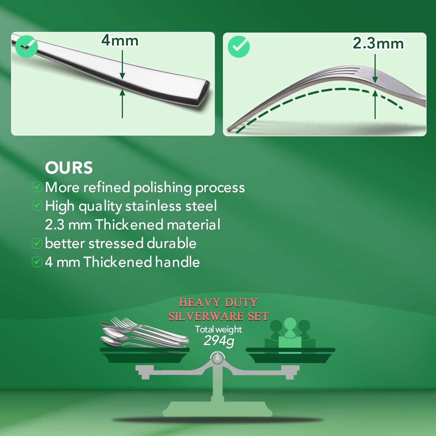 • 【Comfortable Heft & Excellent Workmanship】This spoons and forks set has a moderate size and weight, providing you well balanced and great hand feels. Extra careful polishing of all the edges without rough spots, ensure the safety of your lips.