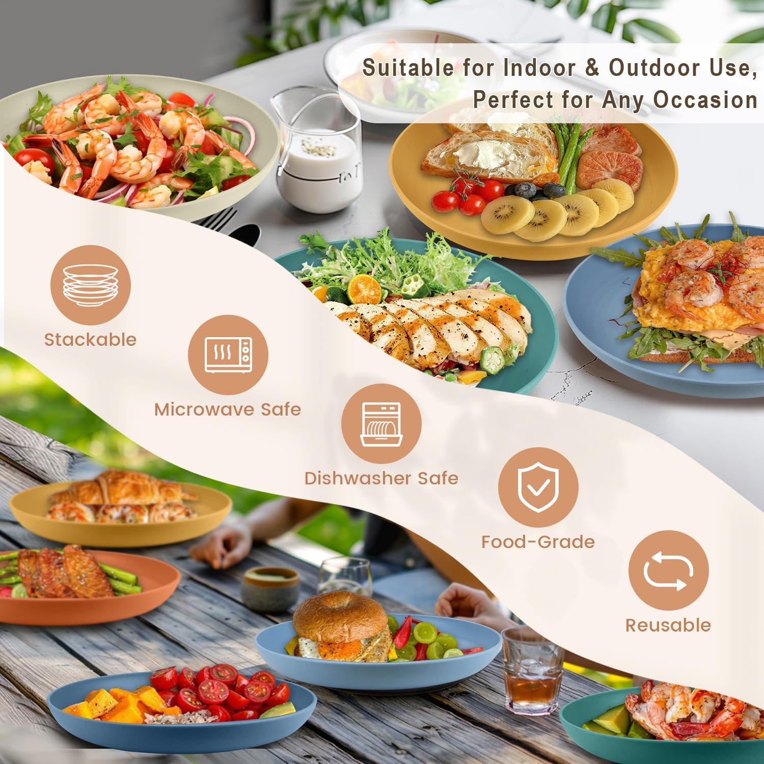 • 𝐂𝐨𝐥𝐨𝐫𝐟𝐮𝐥 𝐑𝐞𝐮𝐬𝐚𝐛𝐥𝐞 𝐏𝐥𝐚𝐭𝐞𝐬: Our Wheat straw plates come in 6 colors, orange, yellow, blue, navy, beige and green. Each color will give you a lot of fun while you use the colorful plastic plates, and your kids will love them too.