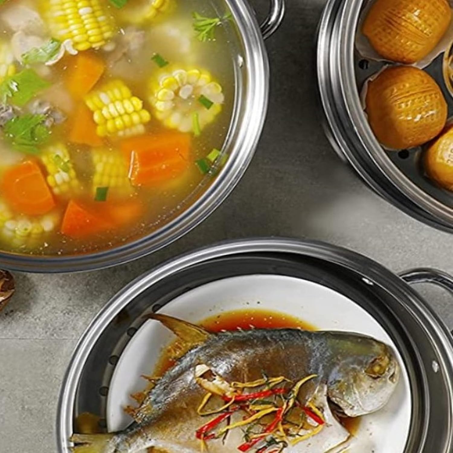 • This steamer 3 tier has attached handles on each compartment which are dual riveted for strength and a plastic opener on top which makes it easy to handle, It provides hassle- free performance for a lifetime and makes a perfect addition to your kitchen and cookware
