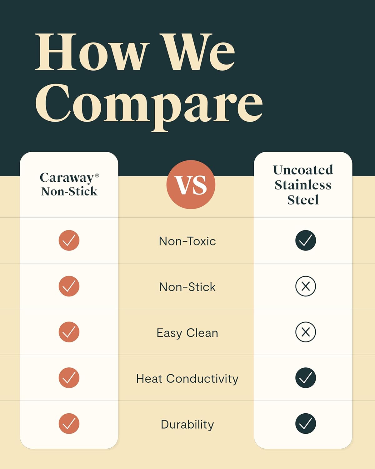 • NON-TOXIC MATERIALS: All Caraway products are free of PTFE, PFOA, PFAS, lead, cadmium and other toxic materials that can leach into your food, making them safe for you, your family, and the environment.
