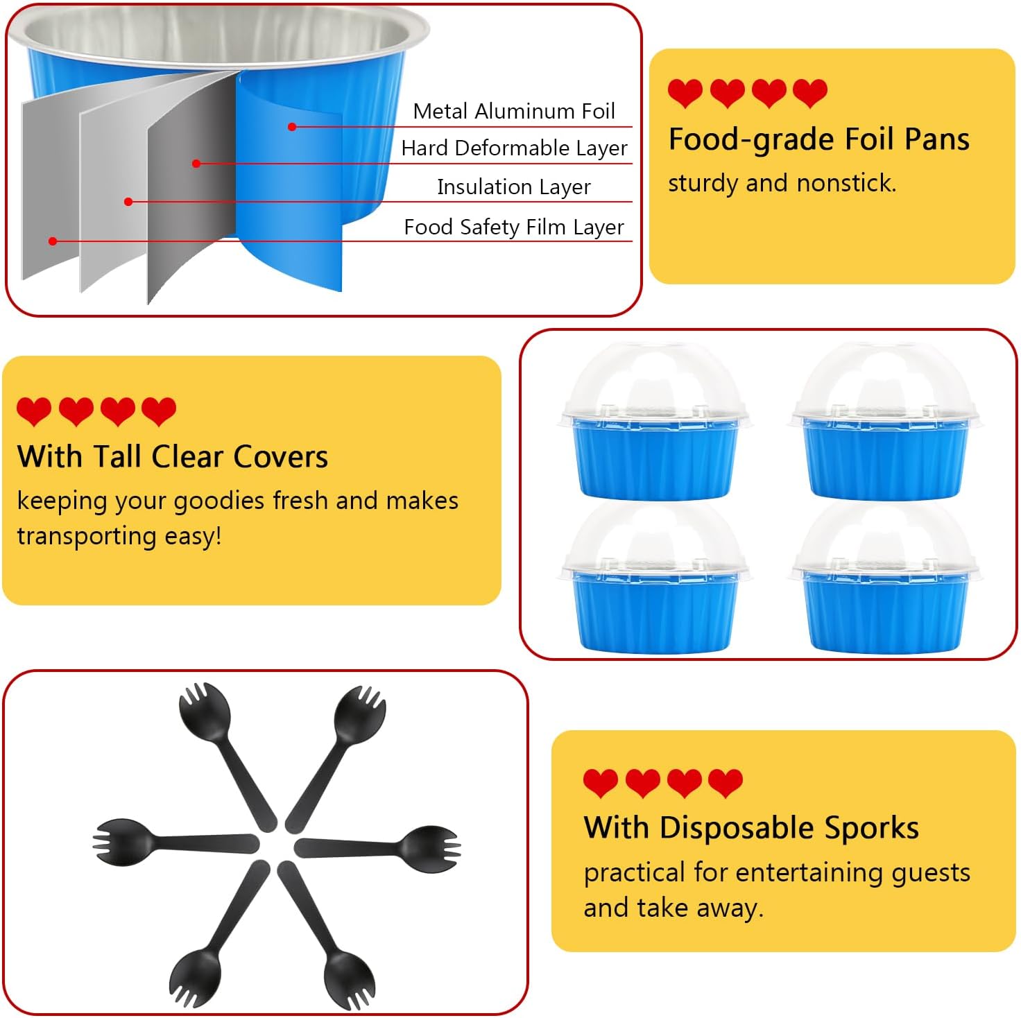 • 【Pack of 50 Sets】 - Including 50pcs cupcake liners with 50 matching transparent dome lids,and 50 individually wrapped spoons.Sturdy muffin cups with lids, facilitate you to carry cupcakes muffin out with no need of cupcake holders.