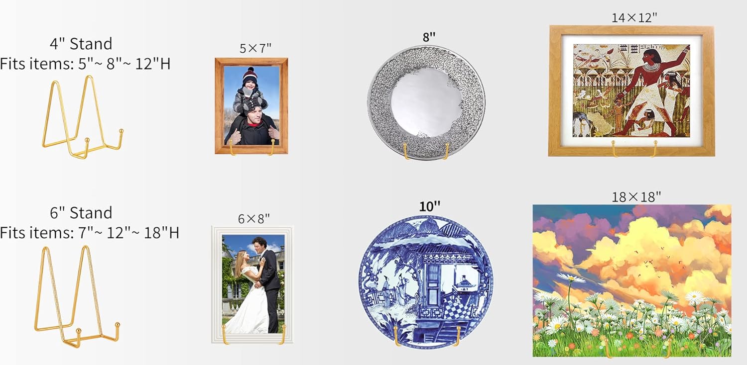 • 5 Pack Stands: The 5 pack plate holder set allows you to meet different needs with one purchase, and it is more cost-effective. You can use the display stand to place your photos, artwork, open books, mobile phones, tablets…and so on