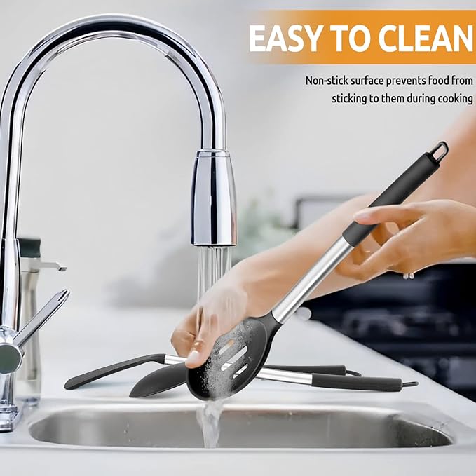 • EASY TO CLEAN & STORE - Non-stick silicone surfaces make food harder to stick to during cooking compared to wooden utensils, Easy to clean by hand and dishwasher safe, Hanging loop attached to the handle for easy storage, Keep your drawer space clear of clutter, Ideal gift for Christmas, Thanksgiving, housewarming