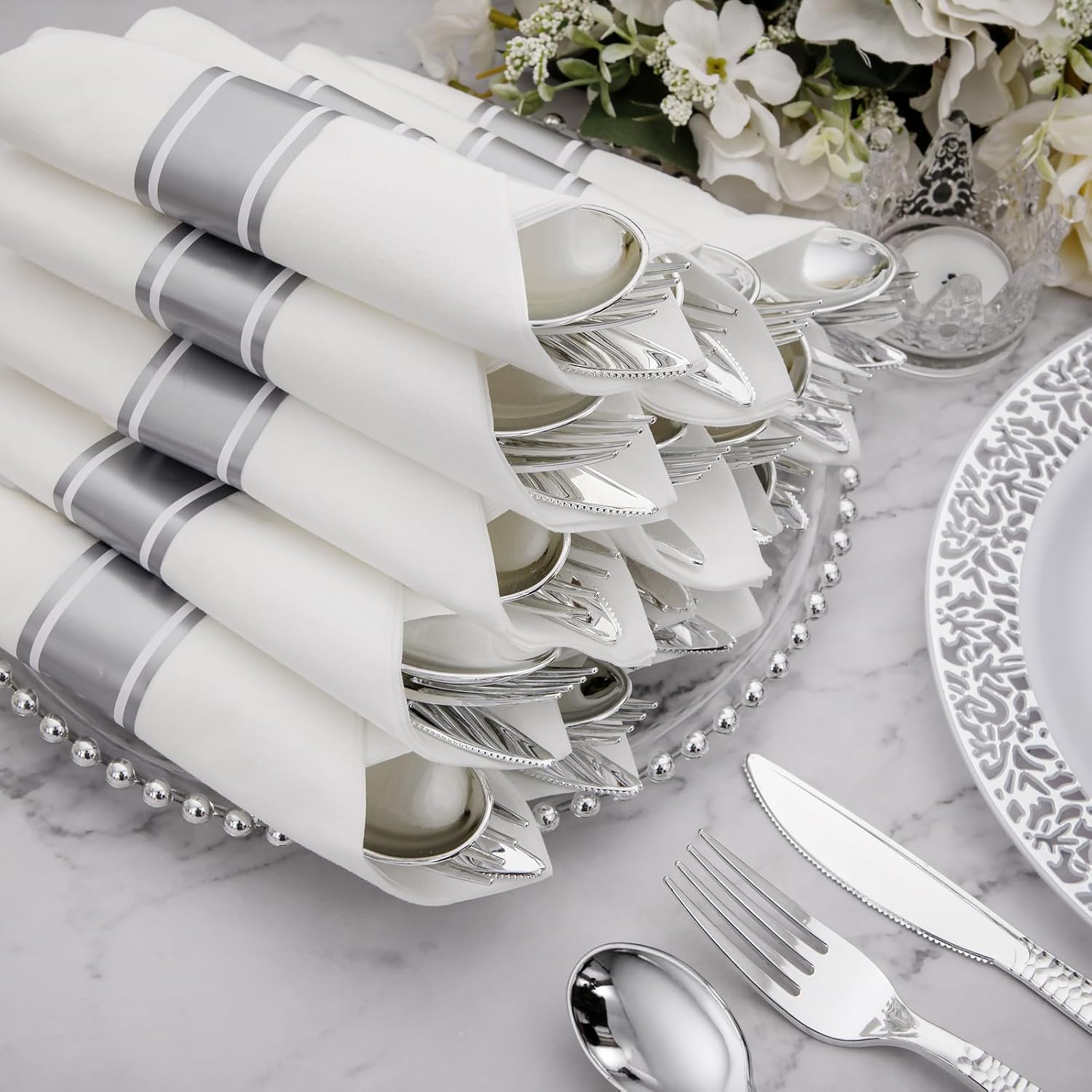 • Convenient Package: This pre-rolled silver plastic cutlery includes plastic cutlery with soft and absorbent napkins for up to 60 people, perfect for weddings, banquets, and holidays.The pre-rolled design saves setup time, making them perfect for larger gatherings.