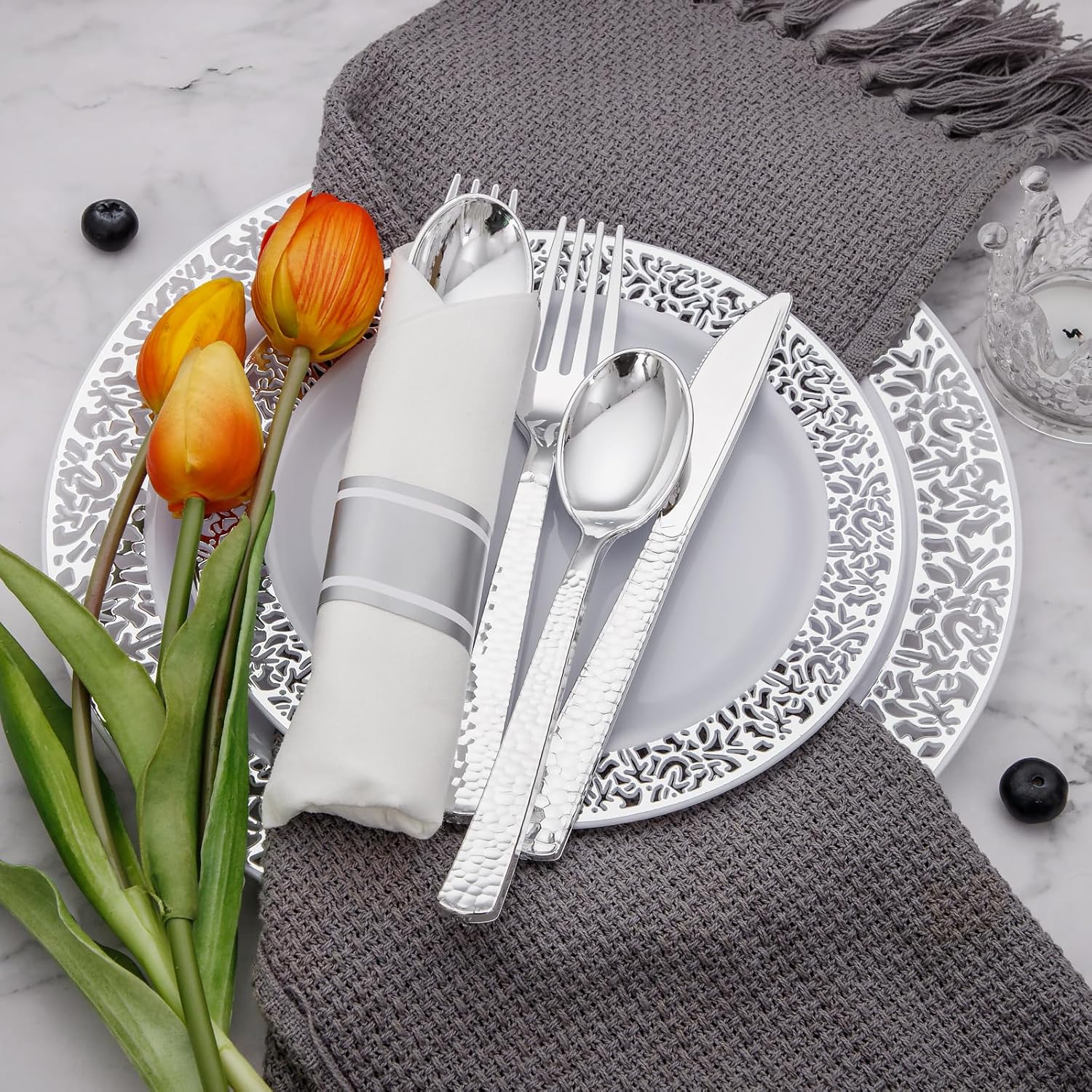 • Elegant Design: Heavy-duty silver plastic with polished finish, serves 60 guests. The silver plastic utensils and napkins complement any party theme, while the sturdy and reusable material adds to the upscale feel of your event.