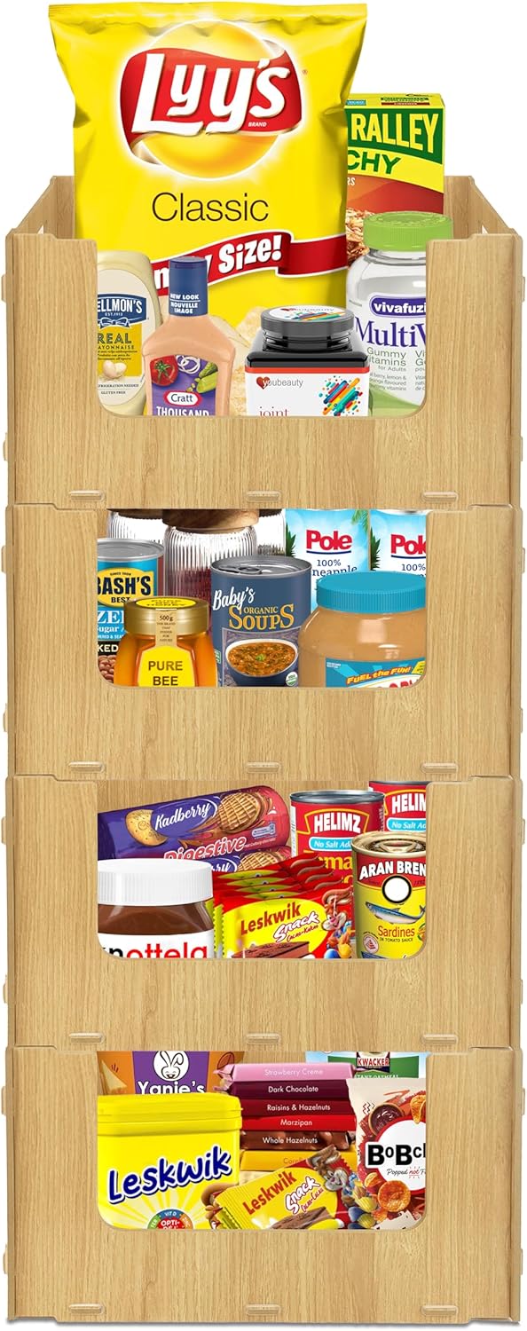 TidyFriend Wooden Stackable Storage Bins for Pantry Organizers and Storage 4 Pack, Pantry Storage for Food, Kitchen and Home Organization (Wood)