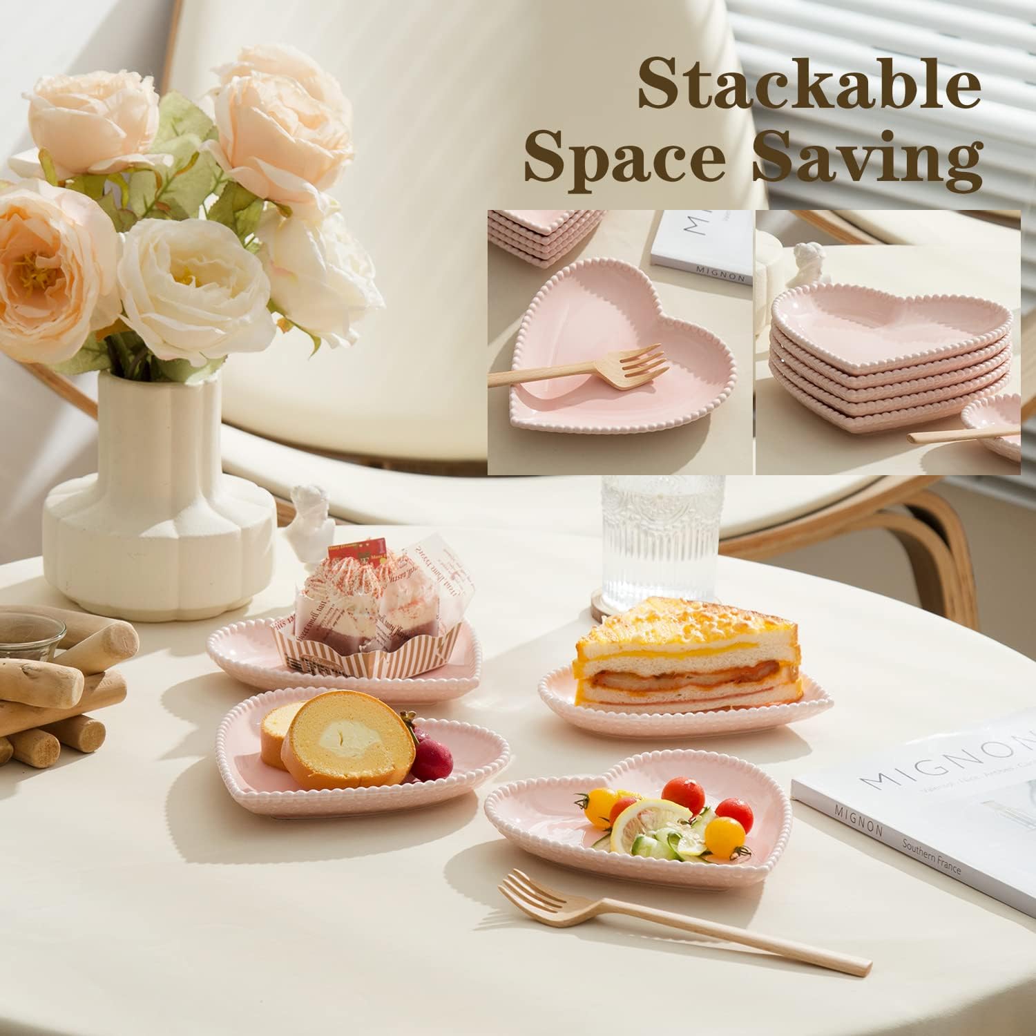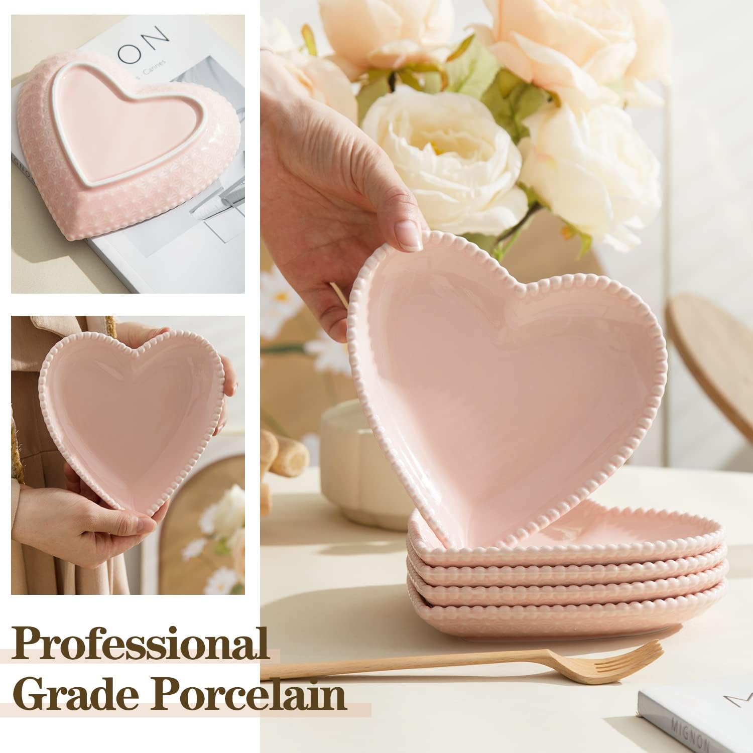 6.3 Inch Porcelain Appetizer Plates Set of 10, Heart Shape Small Dinner Plates, Dessert Salad Plates Serving Dishes for Cake, Snack, Ice Cream, Waffles, Microwave, Oven, Dishwasher Safe, Pink