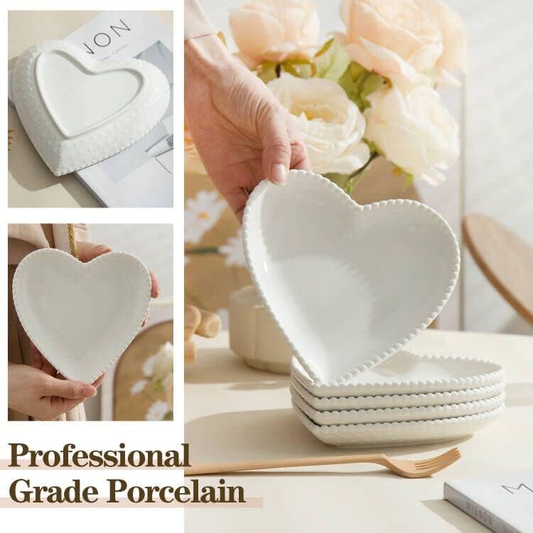 6.3 Inch Porcelain Appetizer Plates Set of 10, Heart Shape Small Dinner Plates, White Dessert Salad Plates Serving Dishes for Cake, Snack, Ice Cream, Waffles, Microwave, Oven, Dishwasher Safe