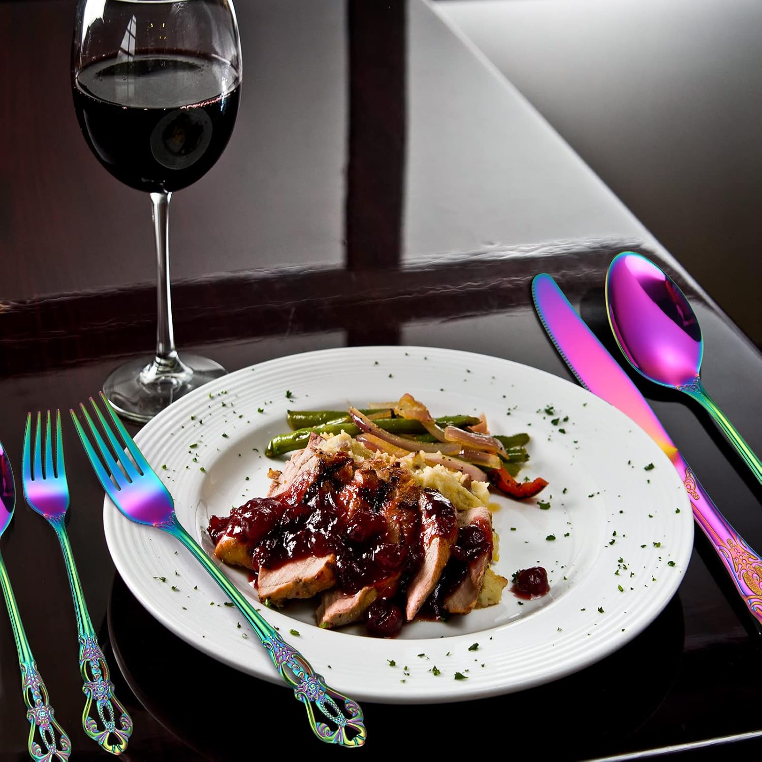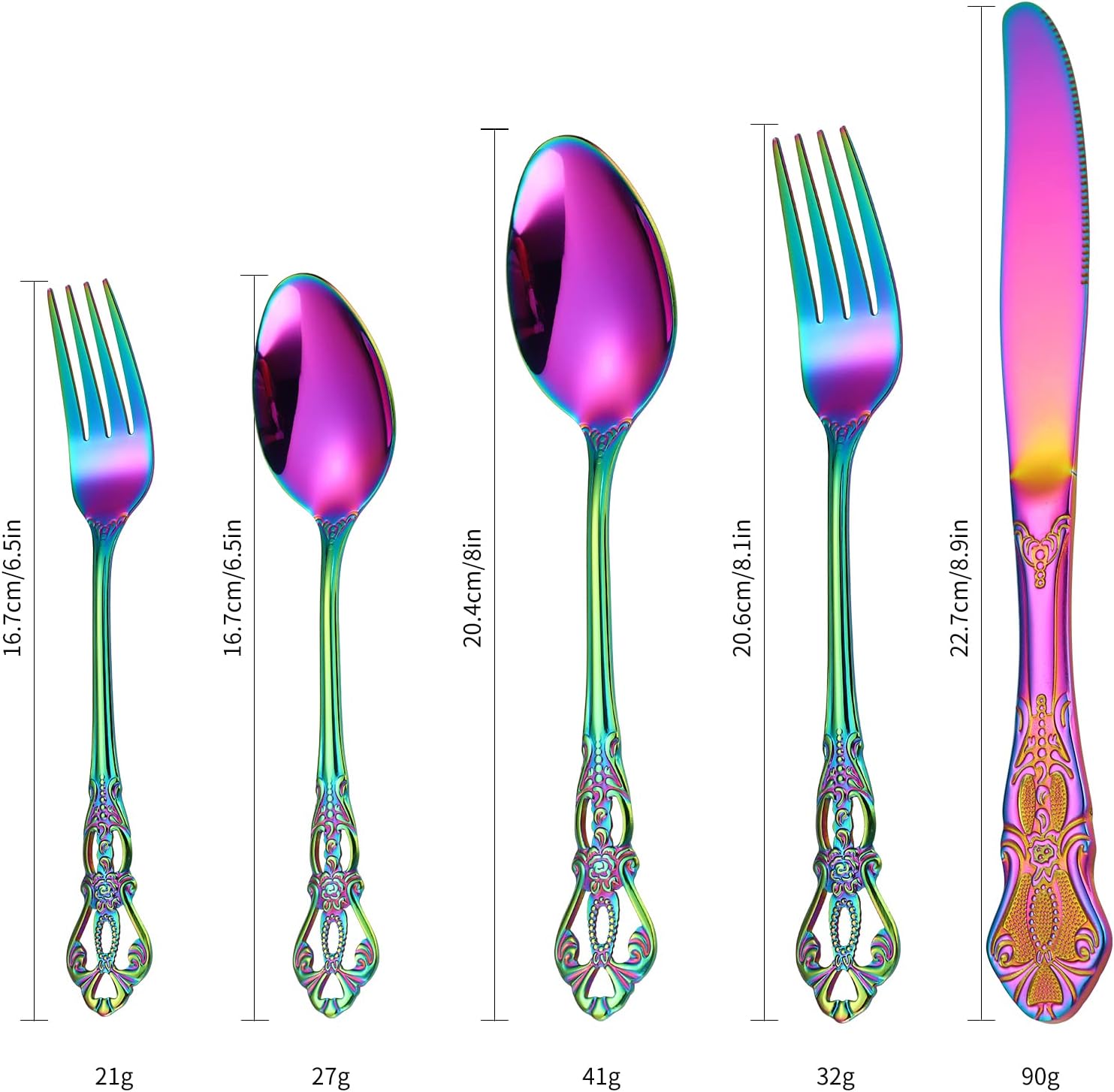 • ORNATE DESIGN rainbow flatware set colorful stainless steel royal silverware: This Vintage Baroque Palace Silverware Set is a true work of art, with intricate and ornate designs that exude opulence and sophistication. Each piece is crafted from quality stainless steel, making it not only beautiful, but durable as well