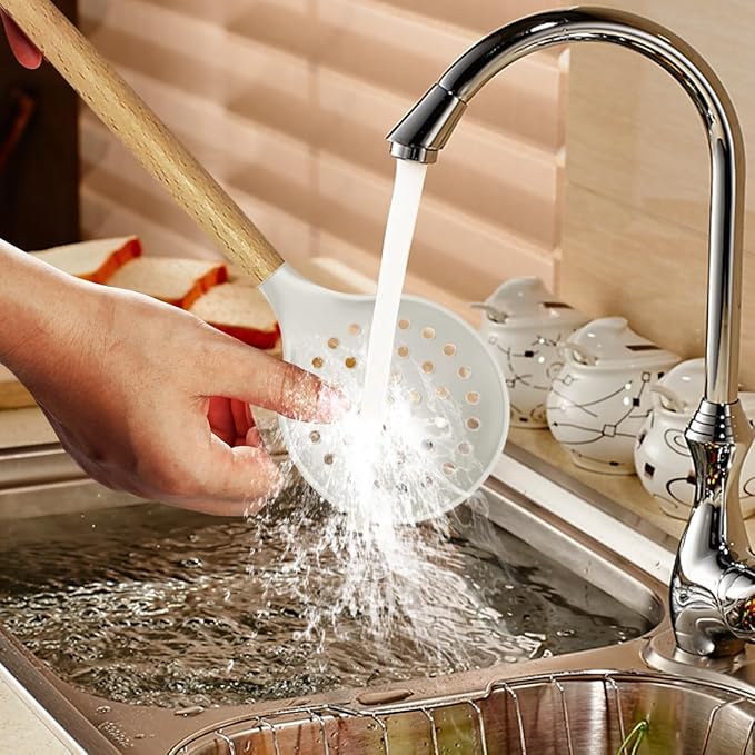 • HEAT RESISTANT & DURABLE: Our silicone kitchen utensils set features upgraded thickened silicone, enhancing durability and elasticity for a smoother cooking experience. Withstands up to 446°F (230°C) without melting or warping, retaining shape even after frequent use. Soft, thick heads protect cookware from scratches, suitable for nonstick pans and daily high-heat cooking