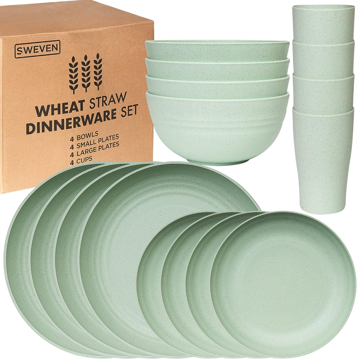 Wheat Straw Dinnerware Sets | Unbreakable Dinnerware Sets | Dishwasher Microwave Safe Dinnerware | Eco Friendly Non Breakable Dinnerware Sets | RV Outdoor Camping (Green, Service for 4 (16 pcs))