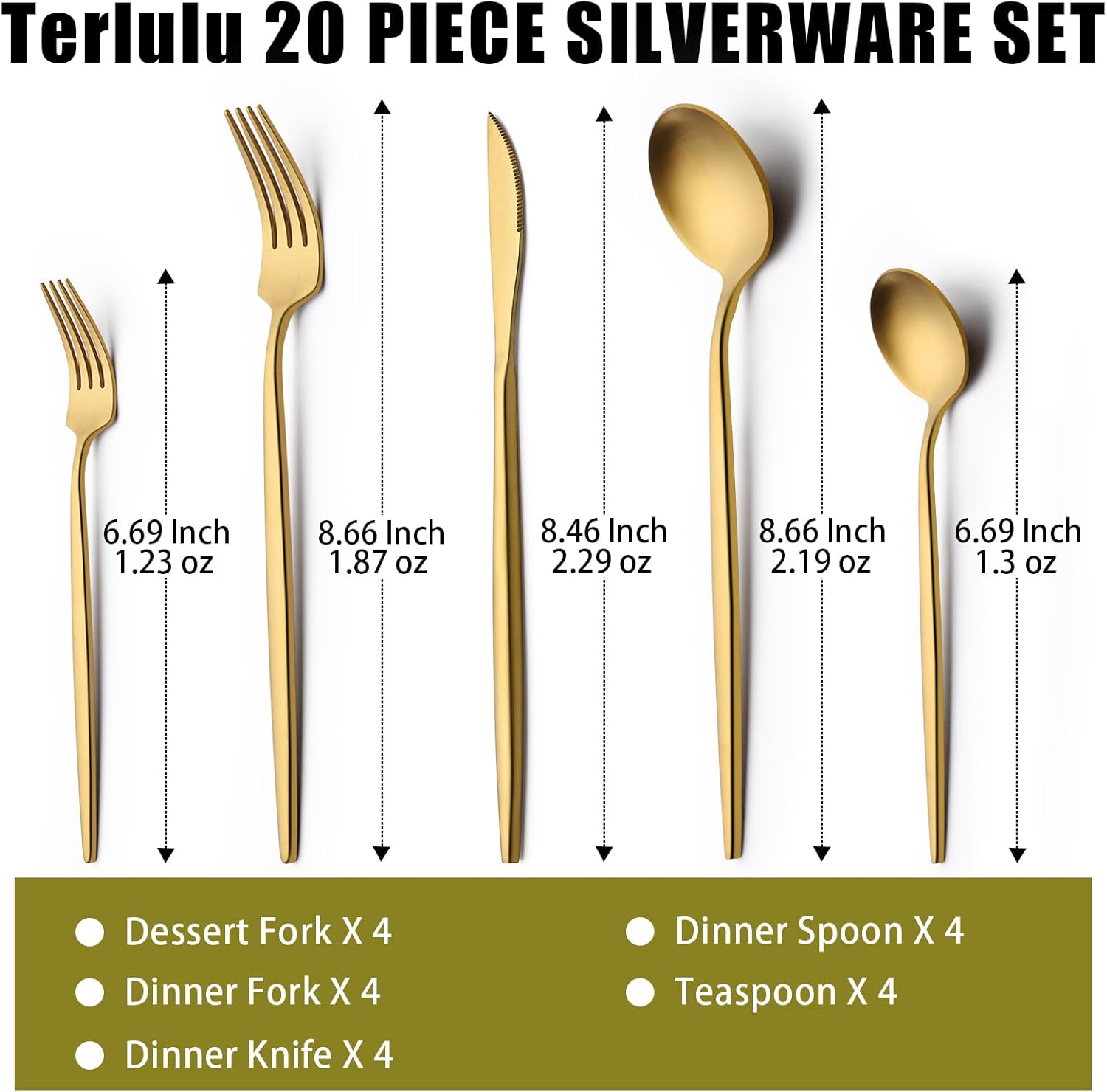 • 【SERVICE FOR 4】 Terlulu 20 piece gold silverware set for 4 includes 4 dinner forks, 4 dinner spoons, 4 dinner knives, 4 teaspoons, 4 salad/dessert forks in normal size, perfect for most families.