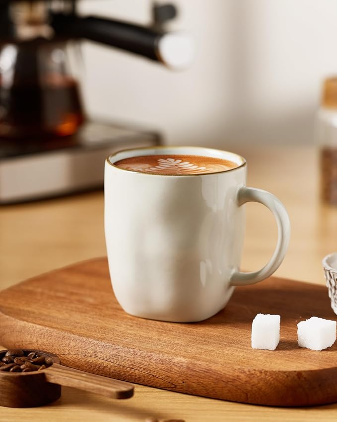 famiware Coffee Mugs Set of 4, Ocean Square 13oz Coffee Cup Set with Handle for Cocoa, Milk, Hot Chocolate, Tea, Water, Stoneware Cups for Kitchen, Microwave and Dishwasher Safe, Vanilla White