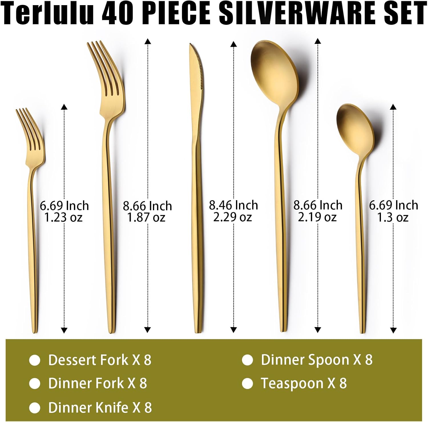 • 【SERVICE FOR 8】 Terlulu 40 piece gold silverware set for 8 includes 8 dinner forks, 8 dinner spoons, 8 dinner knives, 8 teaspoons, 8 salad/dessert forks in normal size, perfect for most families.
