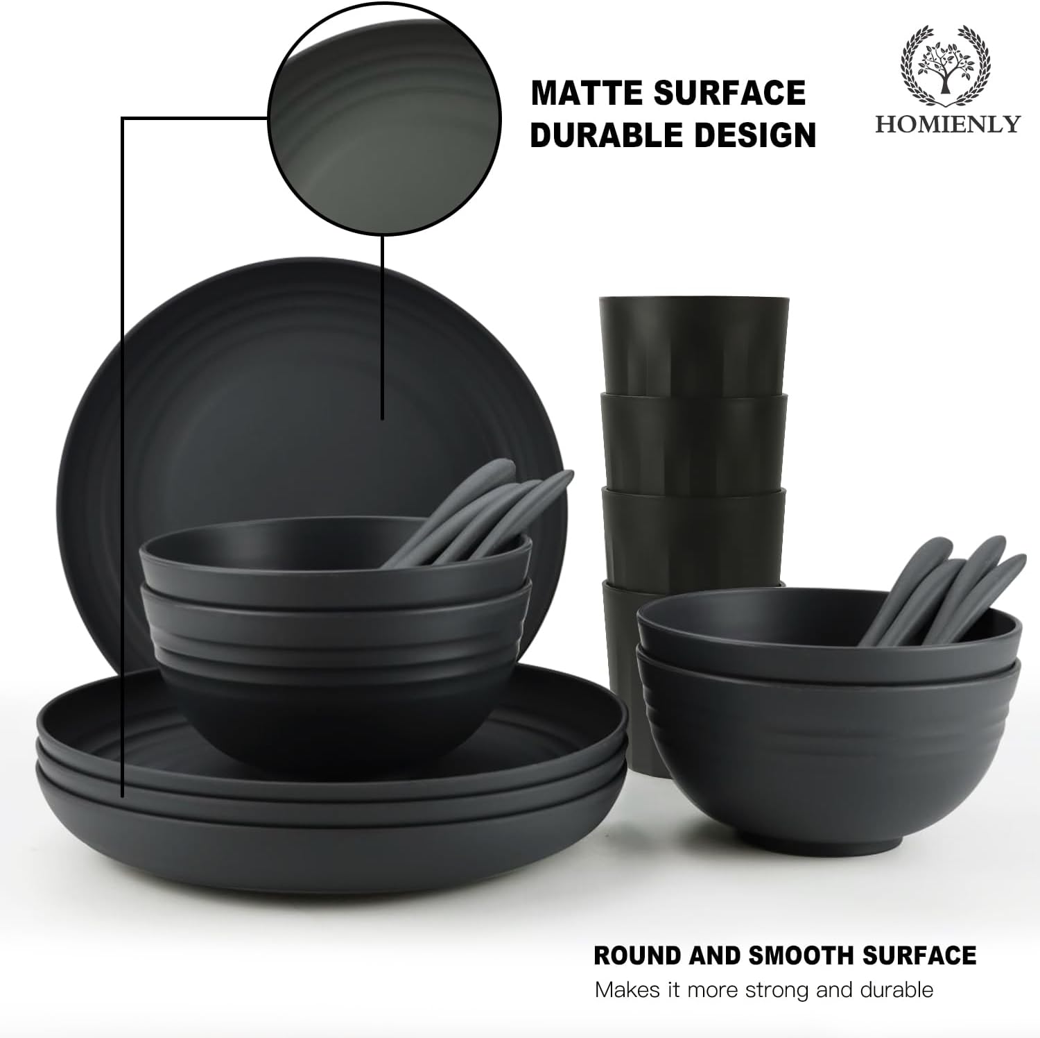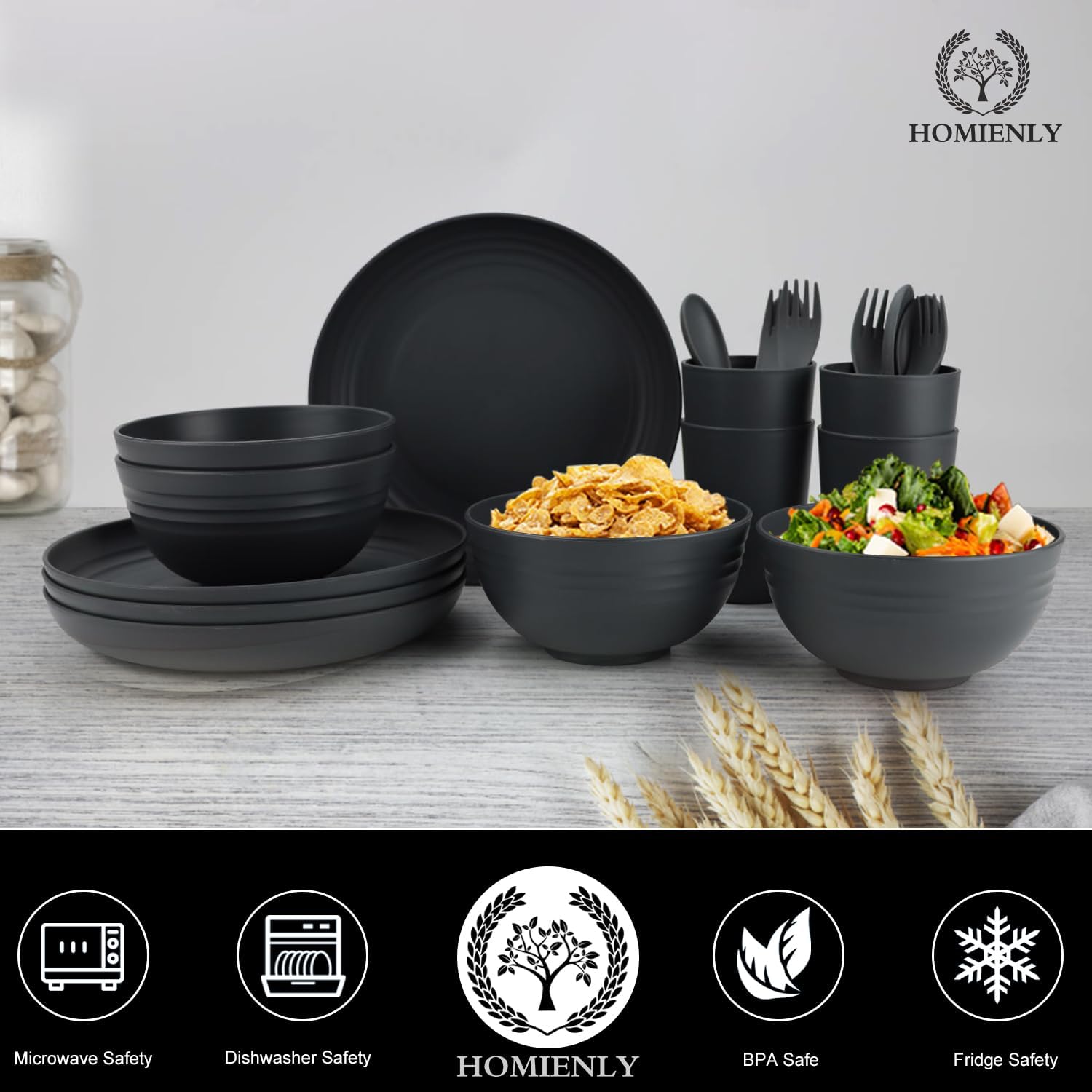 Homienly Wheat Straw Dinnerware Sets, Homienly 20pcs Unbreakable Microwave Dishwasher Safe Tableware Lightweight Bowls, Cups, Plates Set Reusable Dinner Plates Bowls set (Matte Black)